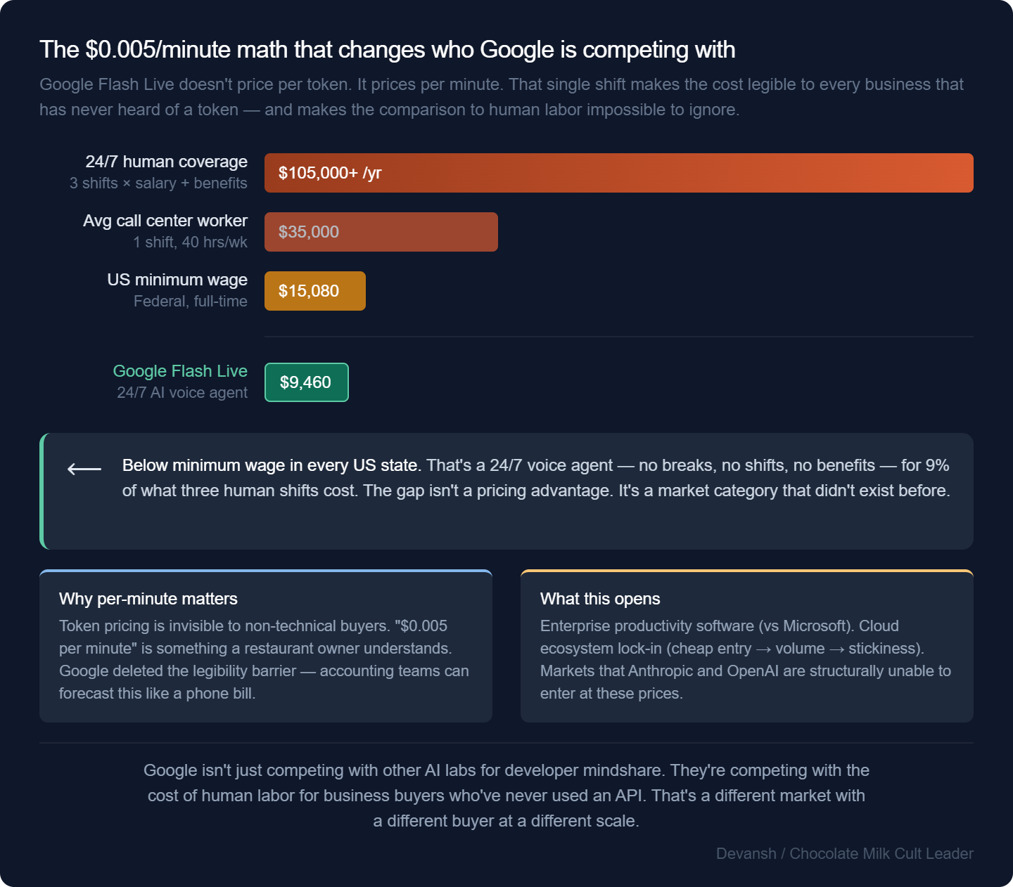 Google dropped Gemini Flash Live to $0.005 per input minute. At $0.018/min output, a 24/7 voice agent costs ~$25/day ($9,460/year), below minimum wage in every US state. The plan is simple: collapse the cost until entirely new markets open that OpenAI and Anthropic can’t reach. Google can sustain this — insane ad profits, vertical integration from silicon to cloud, and nowhere else to deploy that capital at scale.