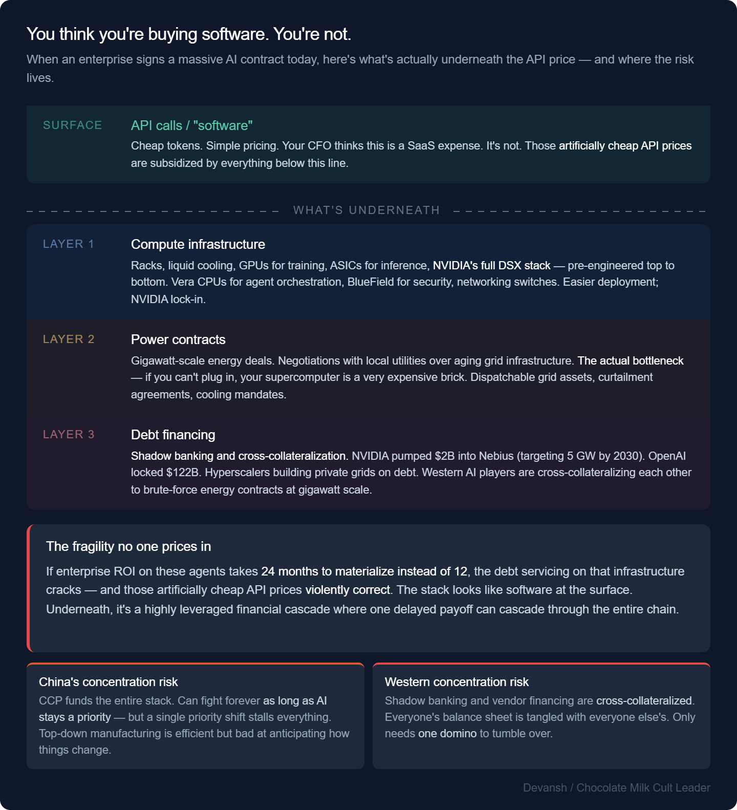 When an enterprise signs a major AI contract today, they think they’re buying software. They’re actually buying into a highly leveraged financial cascade. If enterprise ROI on agents takes 24 months instead of 12, the debt servicing cracks and those artificially cheap API prices violently correct.