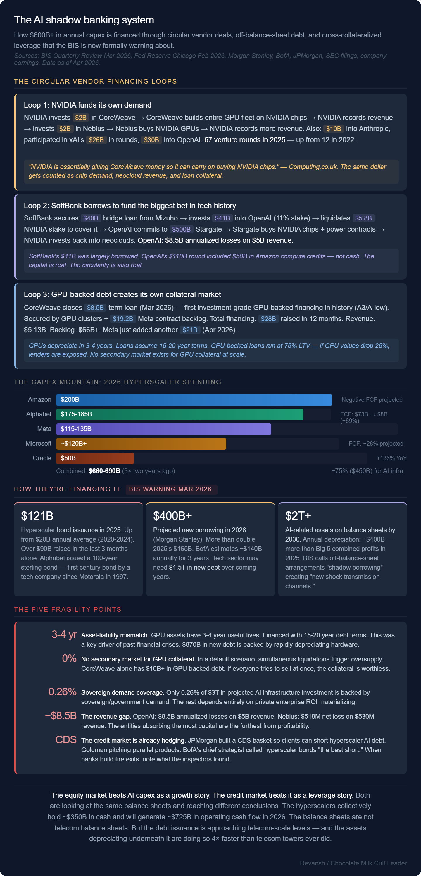 The Western response is shadow banking: NVIDIA pumped $2B into Nebius (targeting 5 GW by 2030), OpenAI locked up $122B, hyperscalers are building their own grids on debt.