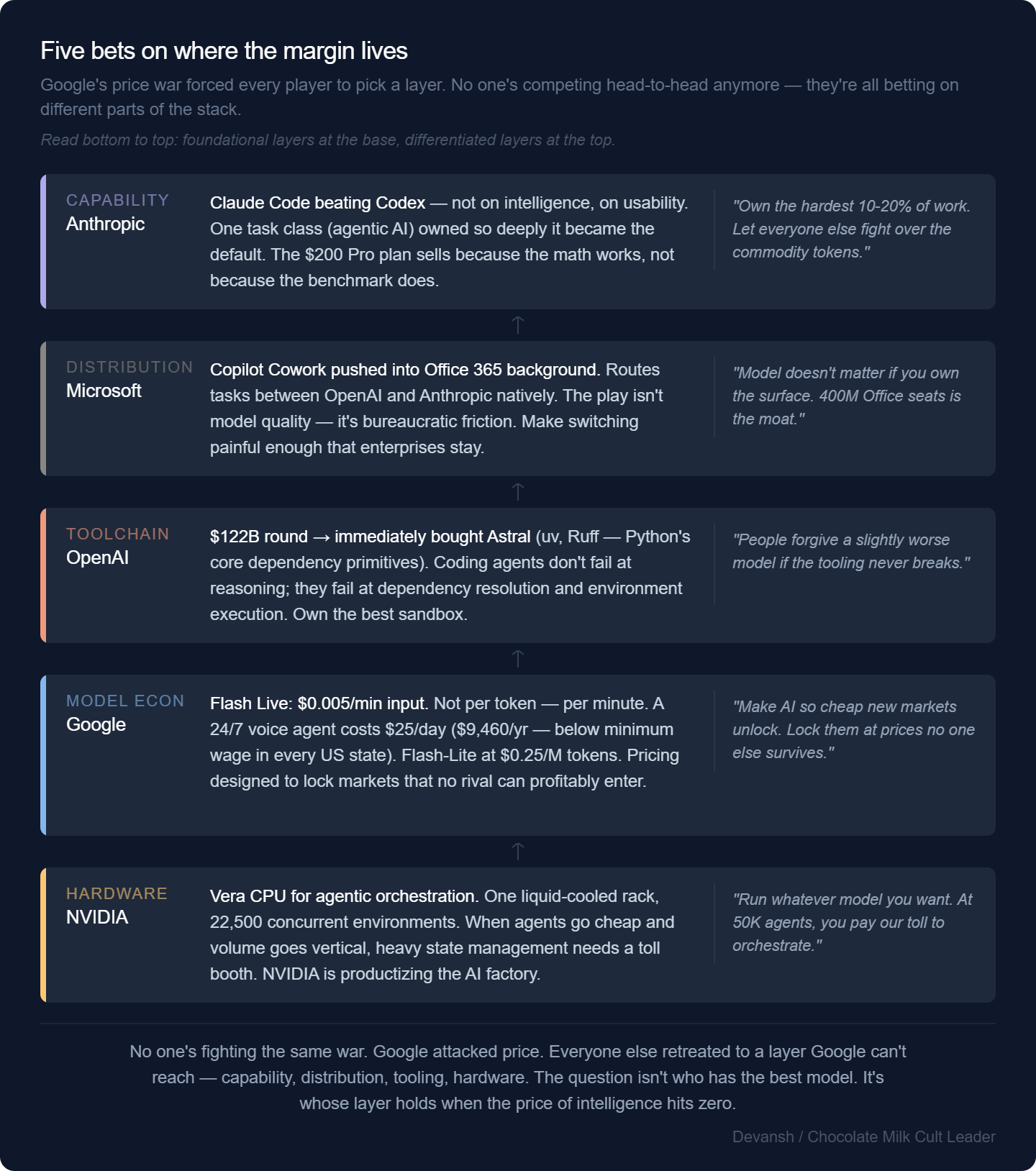 AI Market Report March 2026: Google’s price war, America’s shadow-banking energy play, and why the whole AI stack just fractured into four industries — each with different economics.