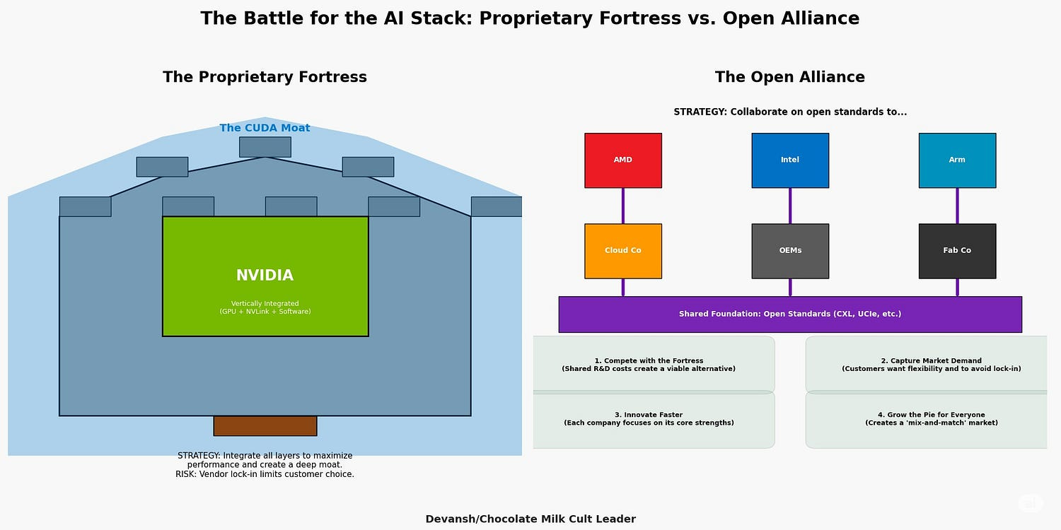 NVIDIA’s Fortress: Full vertical integration. Proprietary GPUs, bound together by NVLink, all run through CUDA. It’s seamless. Fast. And completely closed. The performance is real. So is the lock-in.