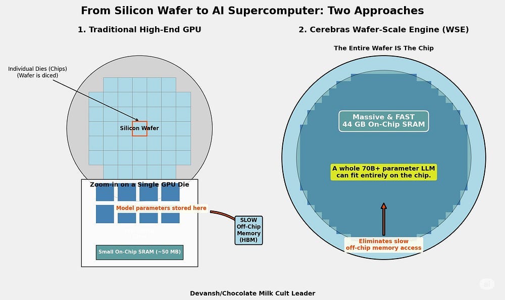 The wafer is the chip. This gets them 44GB of SRAM, letting them handle a 70B param model on a single chip. This setup is allegedly 57x better than the H200 by Nvidia.