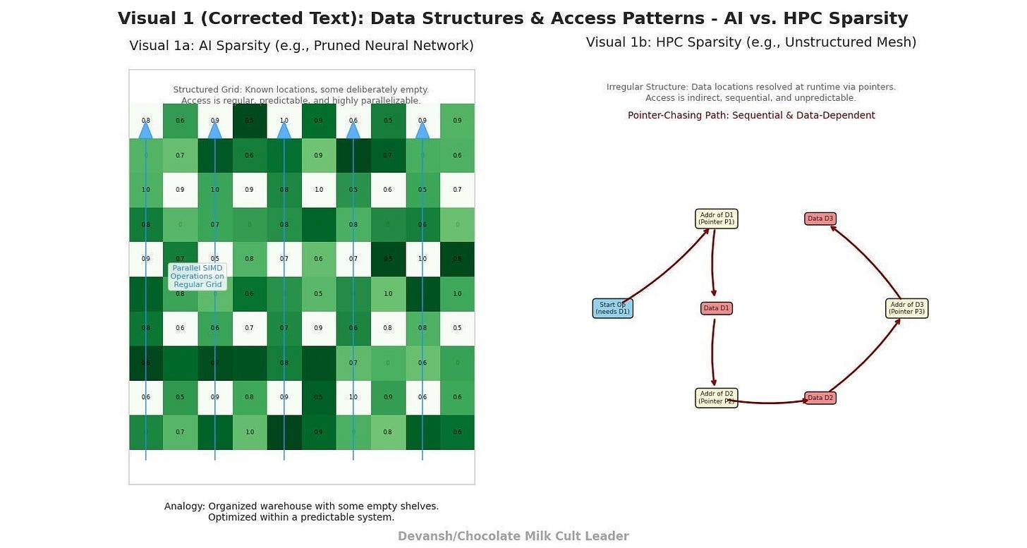 Real-world data isn’t a parade ground. It’s a bar fight. It’s an irregularly structured mess where the important bits are scattered all over the place. We don’t know how to get to them; data flow depends on conditionals that we don’t know until runtime; and the flow is too irregular for us to model preemptively. This is the world of true sparsity. While AI Sparsity (lots of zeroes in networks) is hard enough for our systems, it is this system that brings the true terror.
