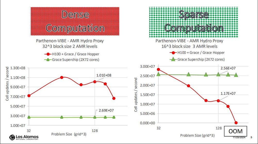 In some cases, the performance collapses completely — for certain kinds of high-memory sparse compute tasks, GPUs collapse while CPUs eventually get something-