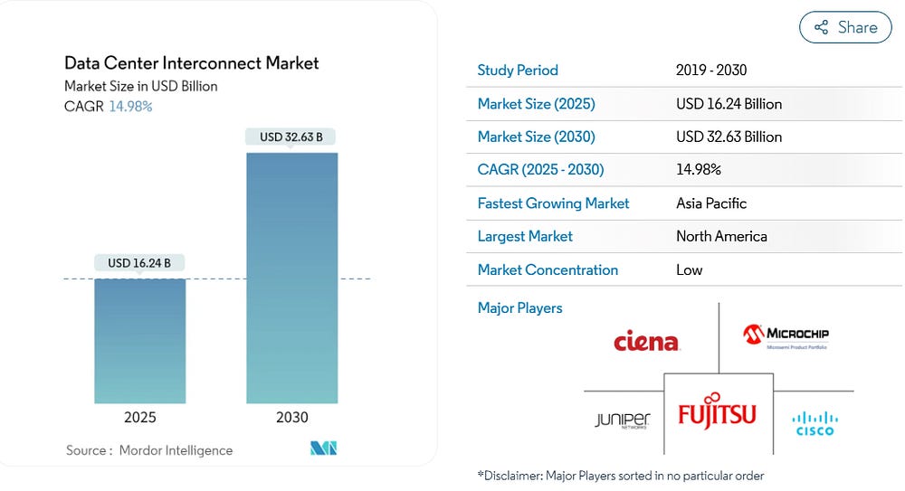 Meanwhile, the hardware layer is undergoing its own arms race. The Data Center Interconnect (DCI) market is forecast to nearly double — from around $16 billion in 2025 to $33 billion by 2030. This driven by immediate neccesity: Enterprises are buying faster networks because their current ones can’t keep up with the chips they’ve already paid for.