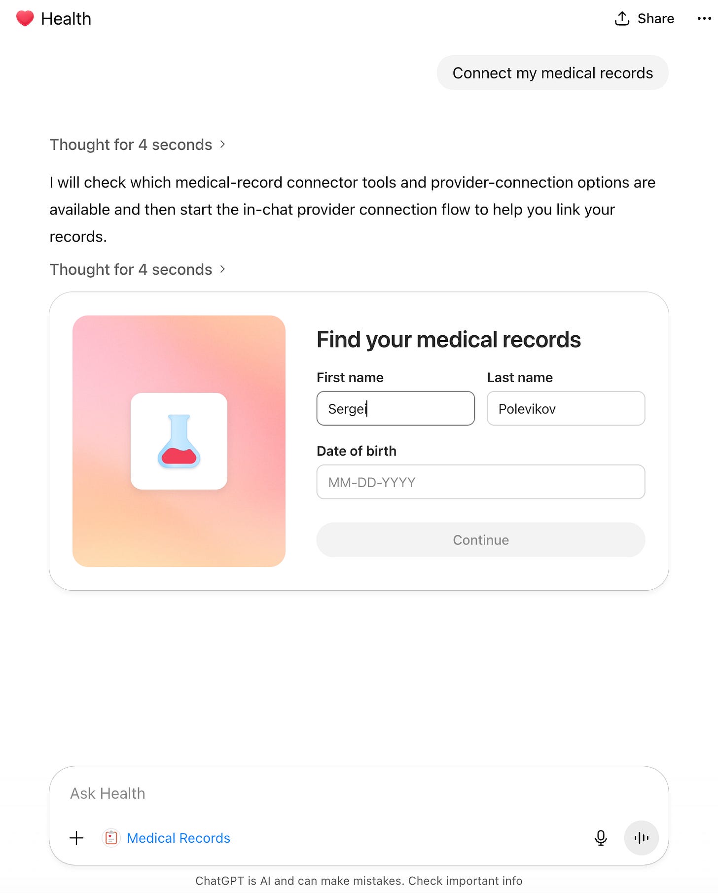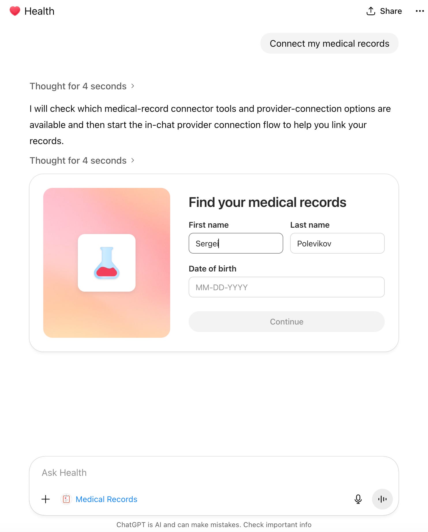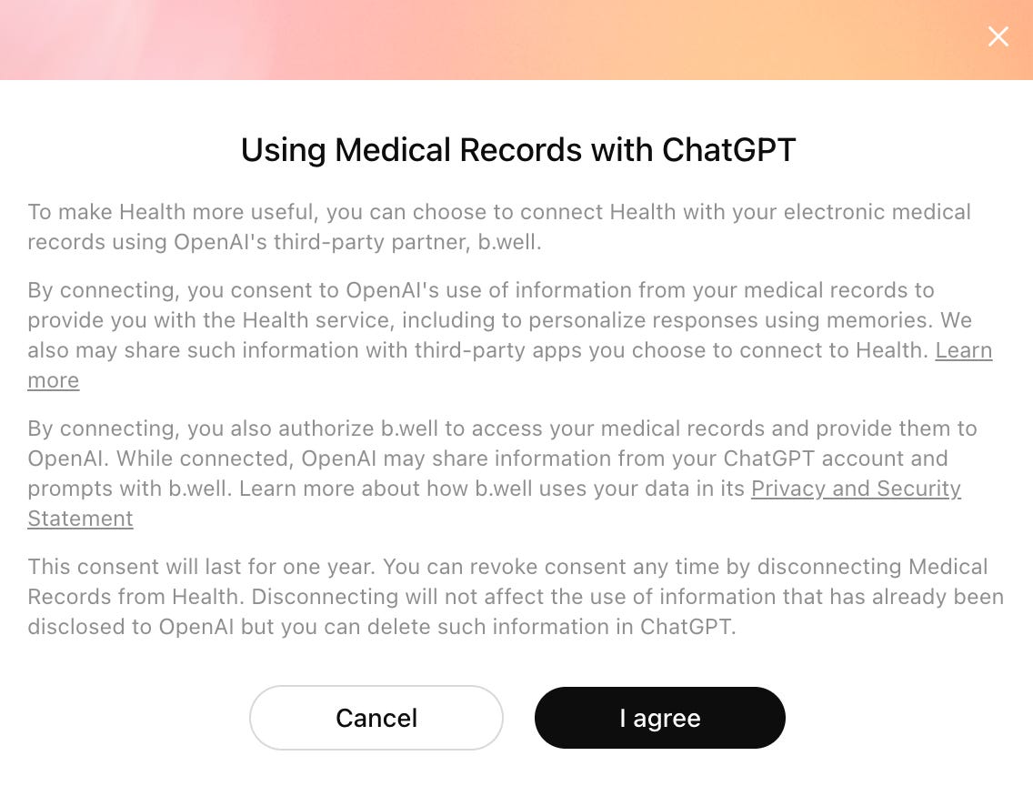 Here I’m consenting to a third party, b.well, having access to my medical records, which may or may not follow the same privacy standards as OpenAI. As I said before, we only live once. F*ck it.