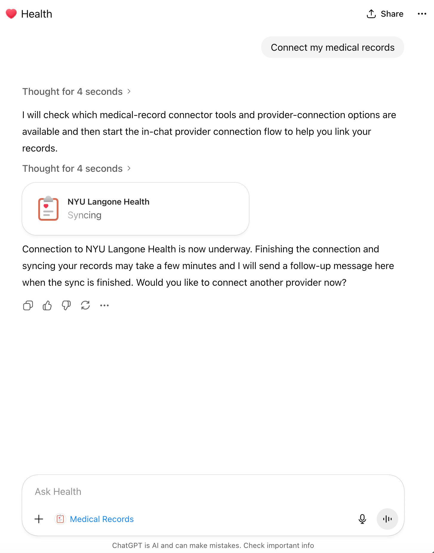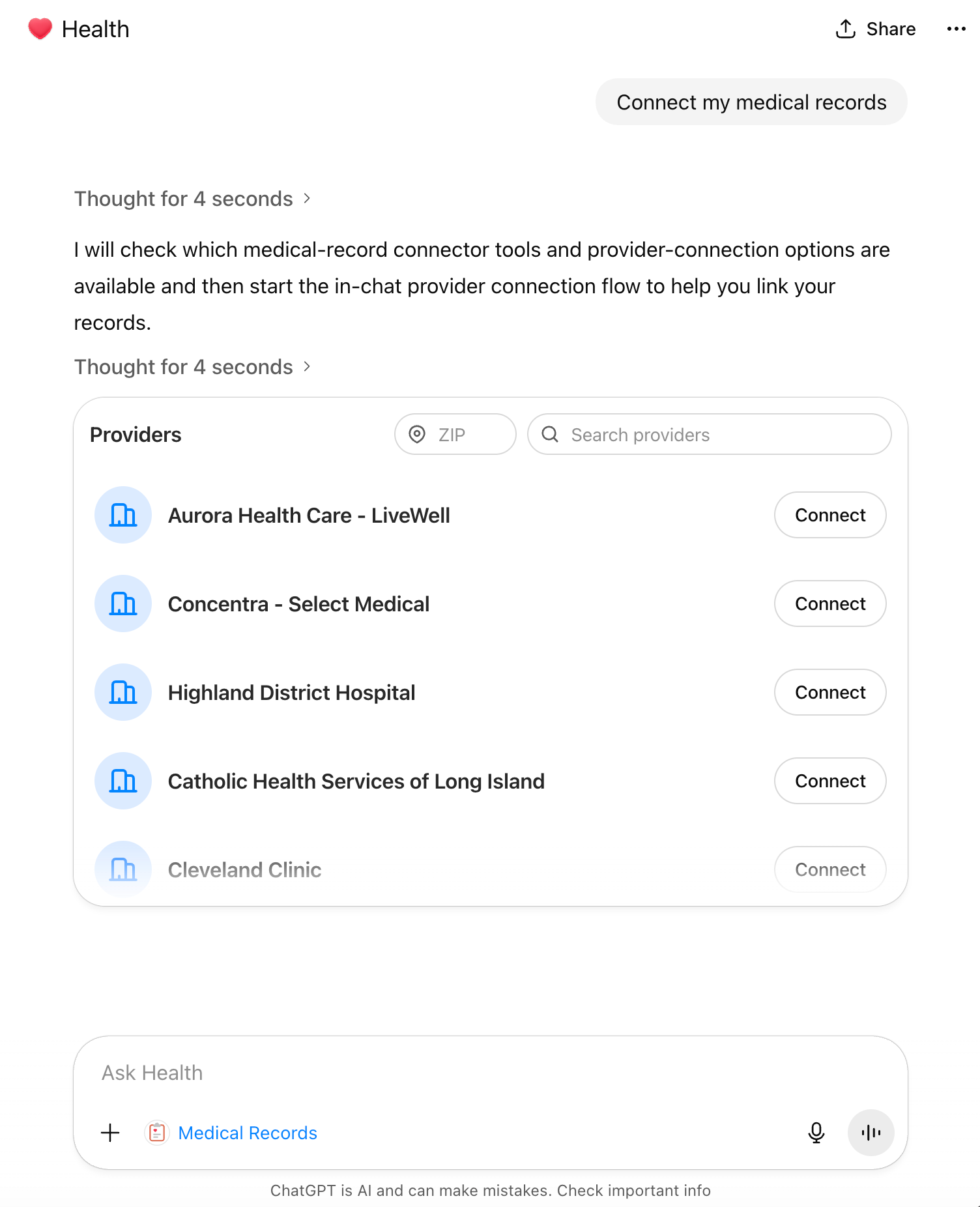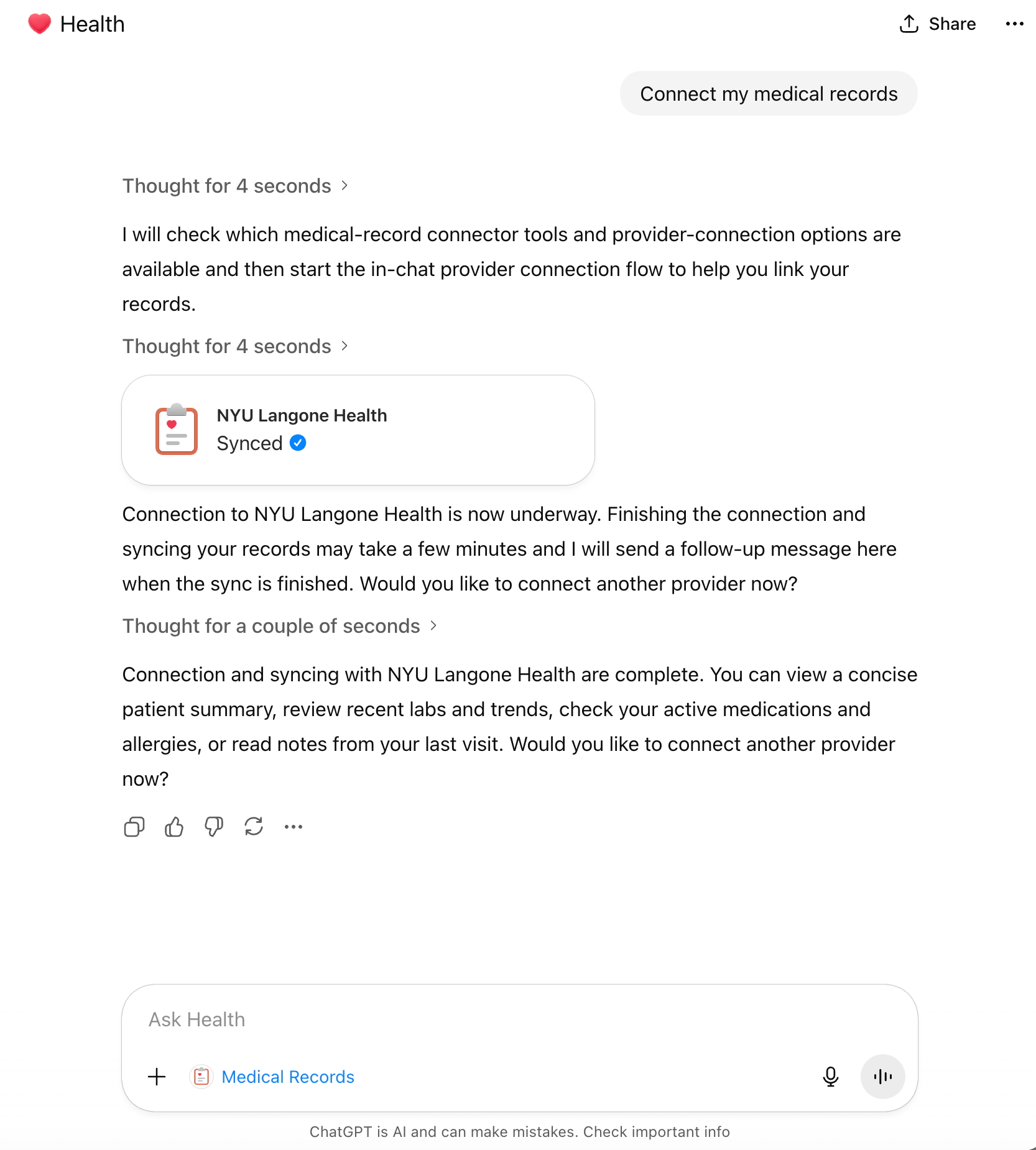 Here I’m consenting to a third party, b.well, having access to my medical records, which may or may not follow the same privacy standards as OpenAI. As I said before, we only live once. F*ck it.