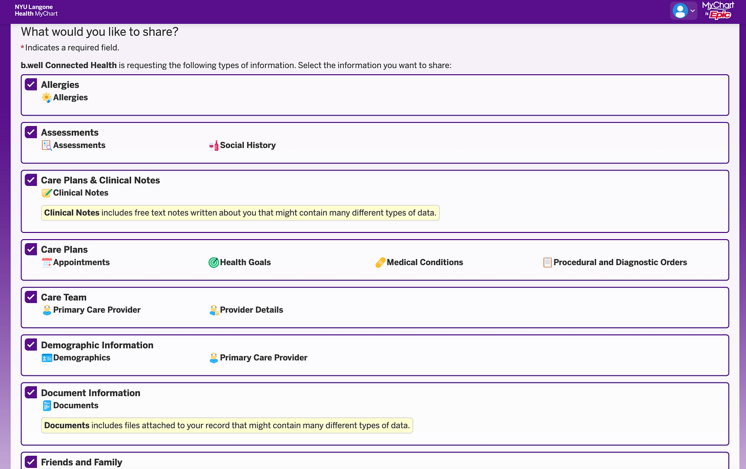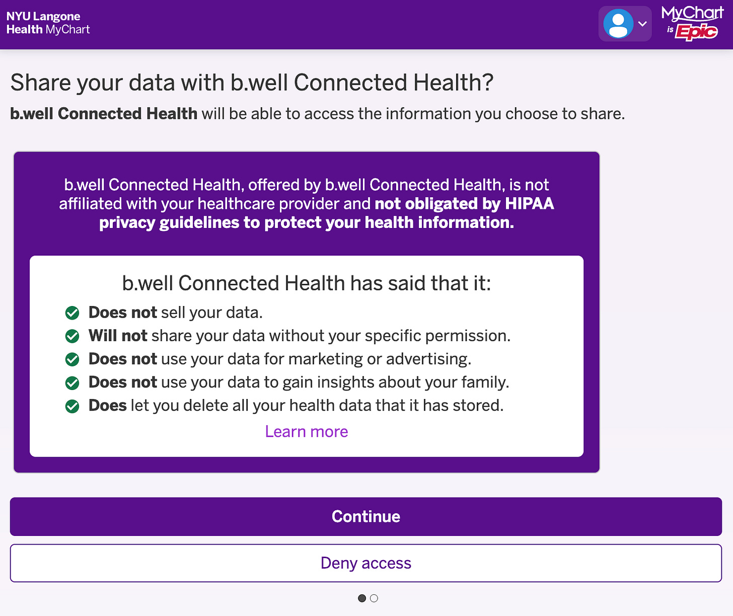 So I basically took b.well by the hand and literally handed it the key to my NYU Langone MyChart account. No APIs. Nothing. I literally let someone open the front door to my medical data and walked right through that door, ladies and gentlemen.