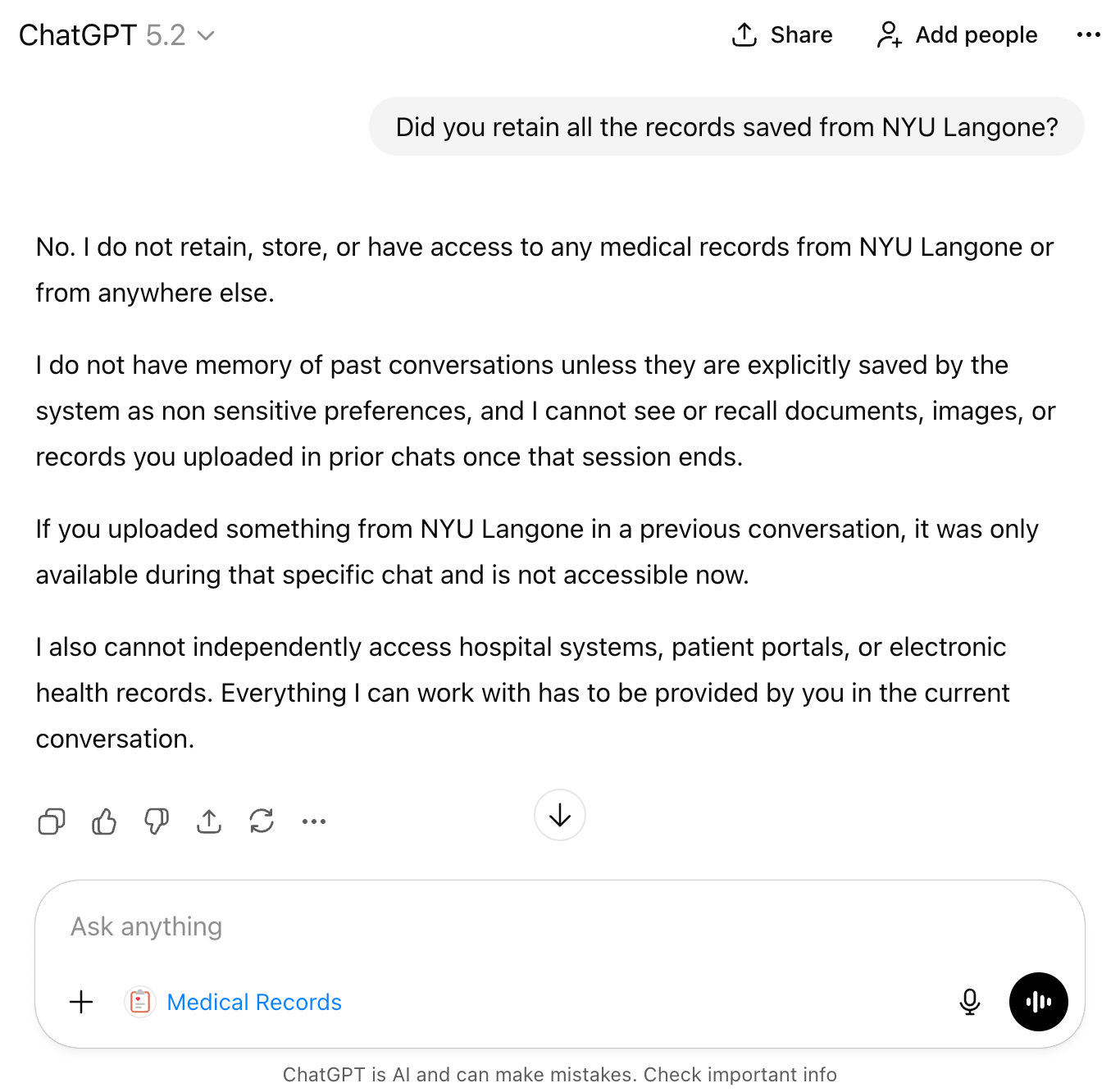 Now add the cumbersomeness and sluggishness of ChatGPT Health in its current form, as I described above. There is no way most patients use it more than once.