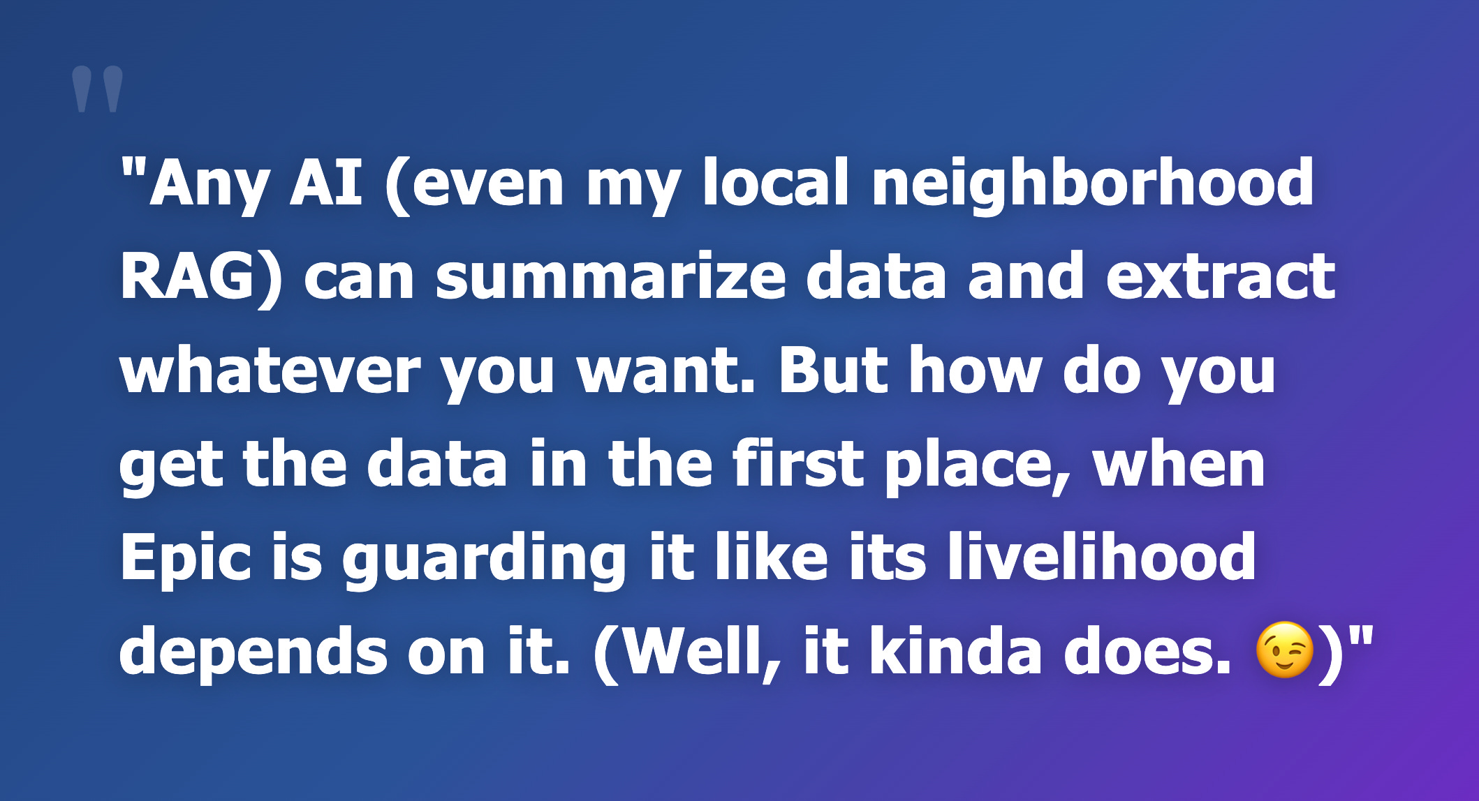 Any AI (even my local neighborhood RAG) can summarize data and extract whatever you want. But how do you get the data in the first place, when Epic is guarding it like its livelihood depends on it. (Well, it kinda does. 😉)