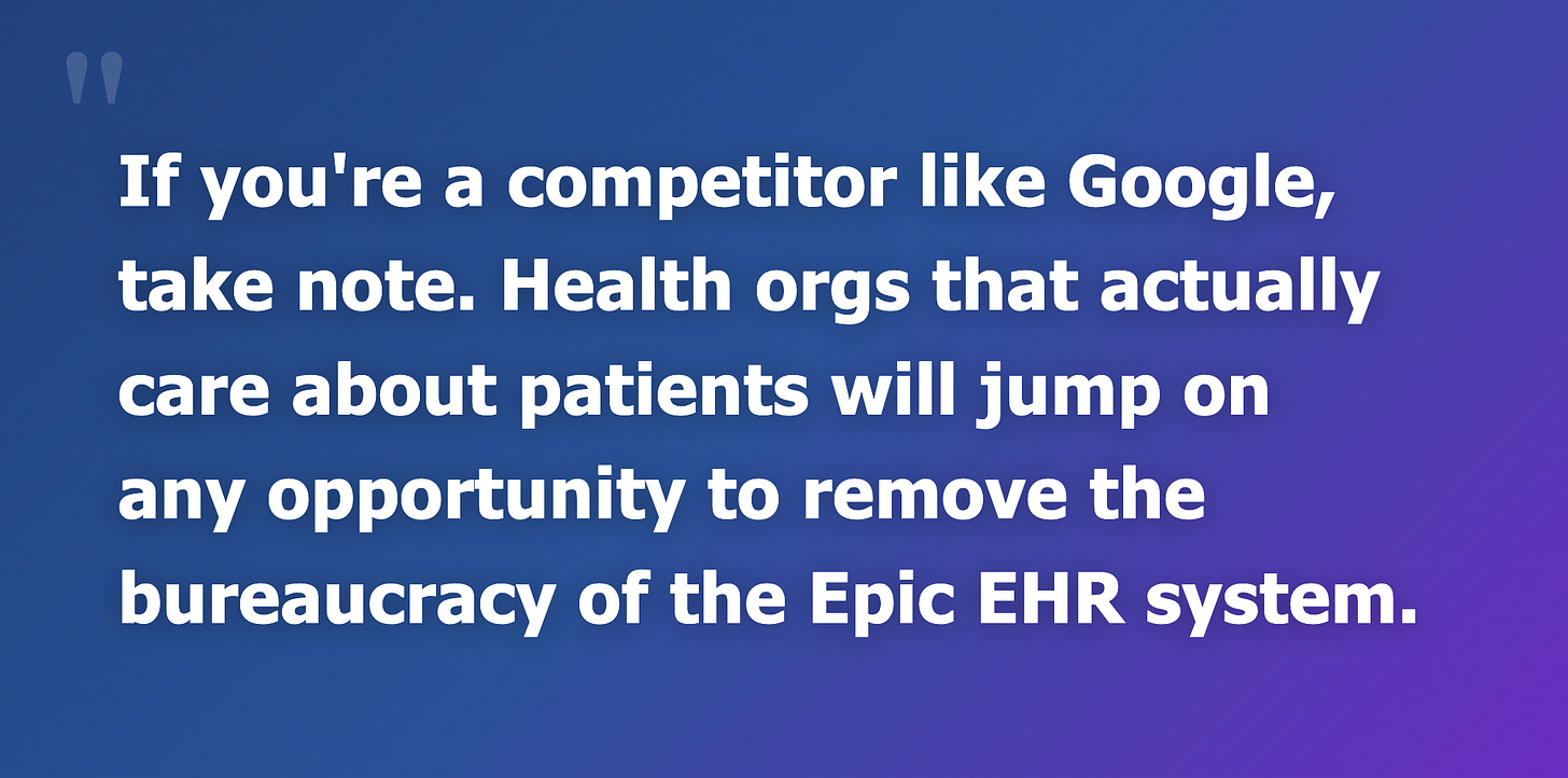 But if you’re a competitor like Google, or Anthropic, take note. Health orgs that actually care about patients will jump on any opportunity to remove the bureaucracy of the Epic EHR system.