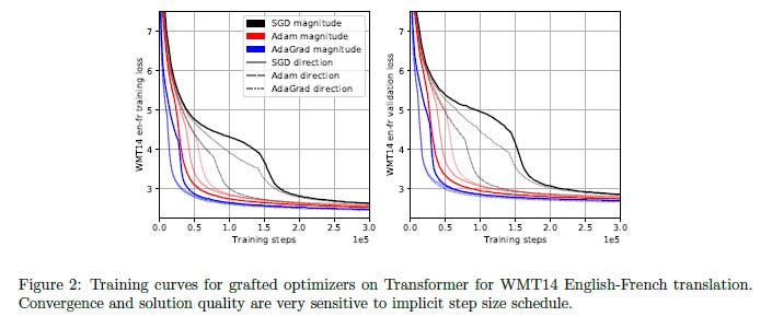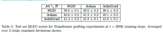 In fact, we see the best result comes from a grafted performer. The authors even highlight this in the paper with their comments, “Interestingly, beyond demonstrating the same clustering of performance metrics by the choice of M, these experiments show that it is possible for a grafted optimizer to outperform both base methods M and D; see Figure 2 for loss curves, and Table 3.3 for the downstream BLEU metric, with which our results are consistent. Again, we are not making claims of categorical superiority under careful tuning, and only the power of bootstrapping; we stress that we did not even tune the global learning rate scalar.”