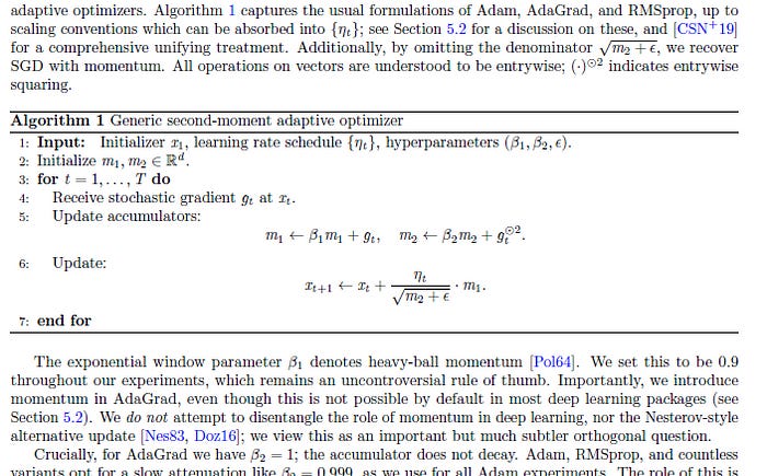 To understand the paper, it is important to understand the basics of the theory they are operating with. Generally, it is assumed that learning rate schedulers like Adam are great because they are able to compute two aspects: the Magnitude and the Direction. Think of the magnitude being the absolute value of the step size, and direction equating to the direction the step is taken in. Remember, since a lot of input data in Machine Learning is high-dimensional, choosing the right direction to traverse is not trivial. The image below is a good overview of second-moment optimizers. Don’t worry if you can’t understand everything, just notice how we are changing the different values based on the gradient we calculate.