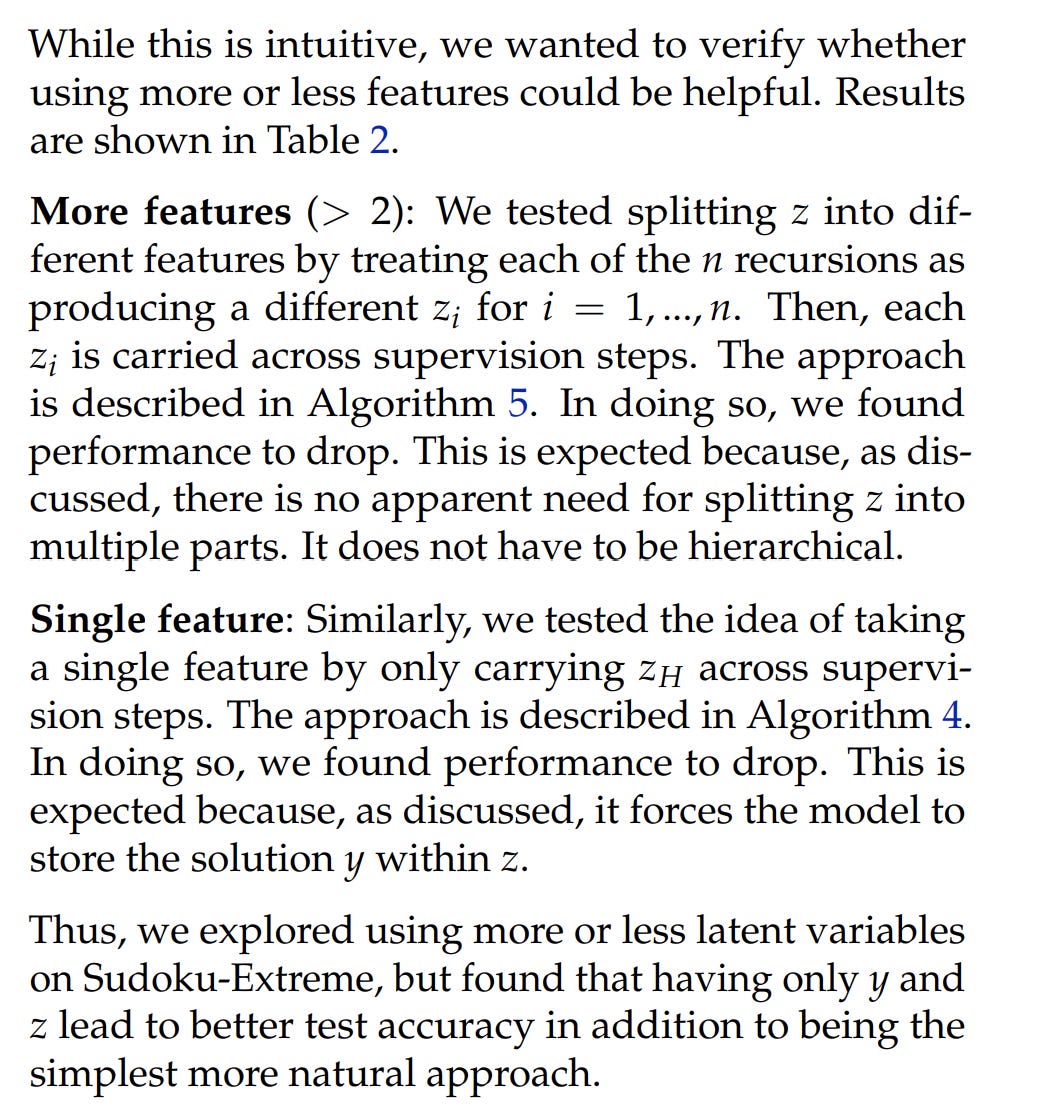 “It answers the question about why two features: remembering in context the question x, previous reasoning z, and previous answer y helps the model iterate on the next reasoning z and then the next answer y. If we were not passing the previous reasoning z, the model would forget how it got to the previous solution y (since z acts similarly as a chain-of-thought). If we were not passing the previous solution y, then the model would forget what solution it had and would be forced to store the solution y within z instead of using it for latent reasoning. Thus, we need both y and z separately, and there is no apparent reason why one would need to split z into multiple features.”