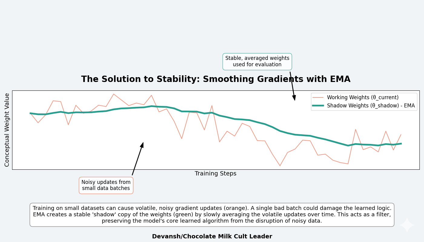 Training on small datasets creates high-variance gradients; a single noisy batch can push the model’s weights in a random direction, catastrophically destroying the fragile, multi-step logic it has already learned. EMA is the solution.