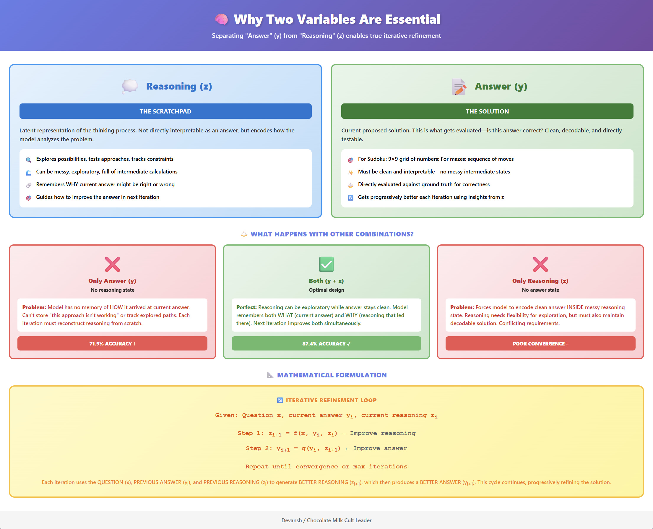 If you only maintain y (the answer), then each iteration must update y directly. The model has no place to store intermediate reasoning. It can’t think “this approach isn’t working, let me try something else” because it has no memory of what approach it’s trying beyond what’s encoded in y itself.