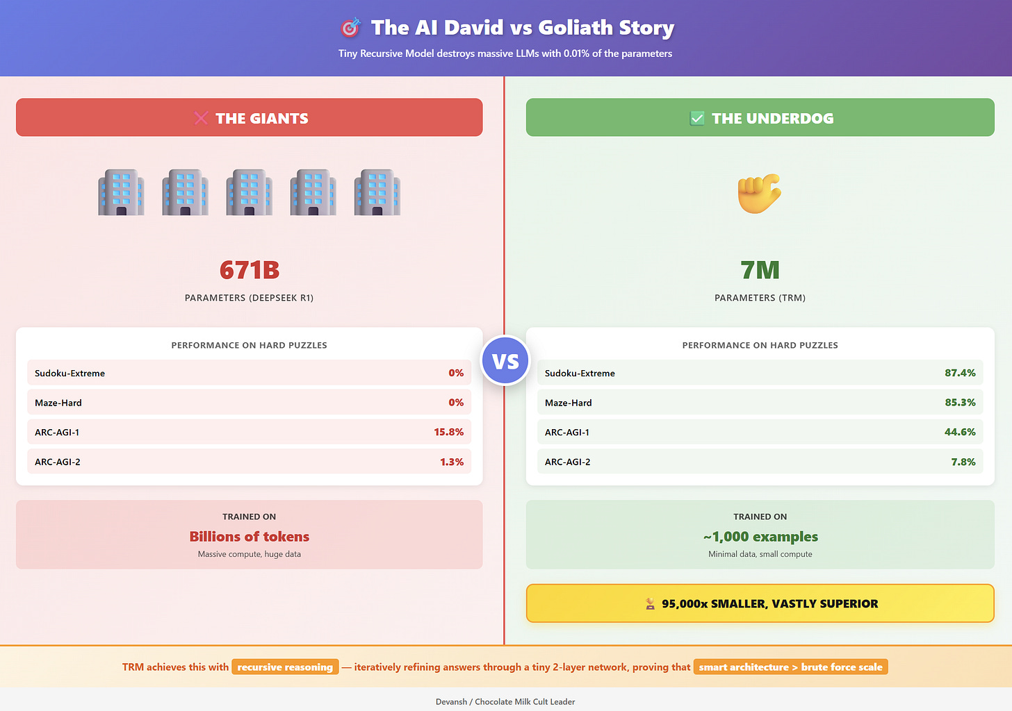 Samsung’s Tiny Recursive Model (TRM) flips that logic. Instead of generating answers once, it thinks in loops — revising, checking, and improving its output over multiple passes. With only 7 million parameters, TRM outperforms trillion-parameter LLMs on hard reasoning benchmarks like ARC-AGI and Sudoku-Extreme.