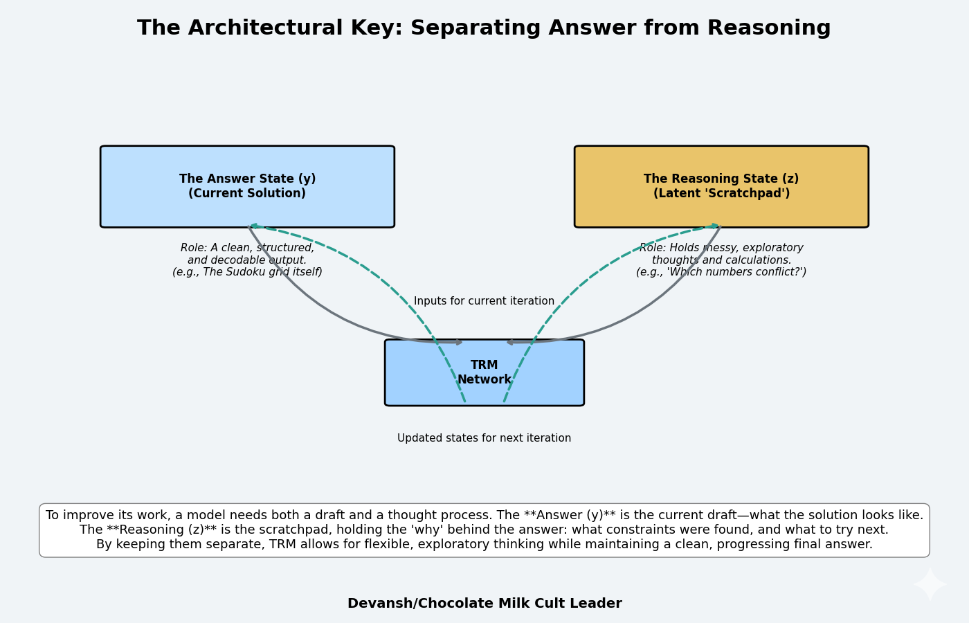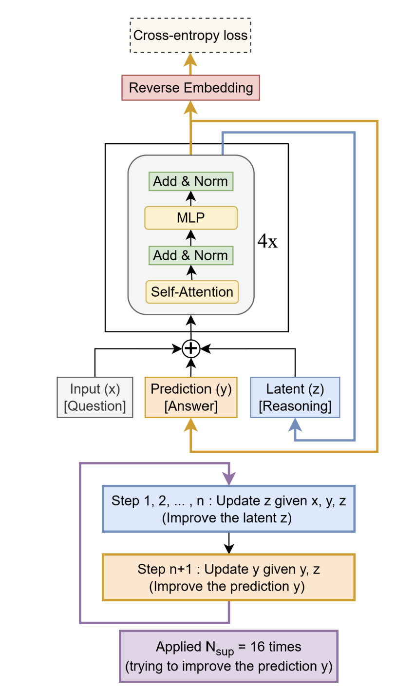 Separating y and z gives the model flexibility: z can be messy, exploratory, full of intermediate computations. Then, when ready, the model can extract a clean answer y from the reasoning state z. The next iteration can look at both — “here’s my current answer y and here’s how I was thinking about it z, now let me improve both.”