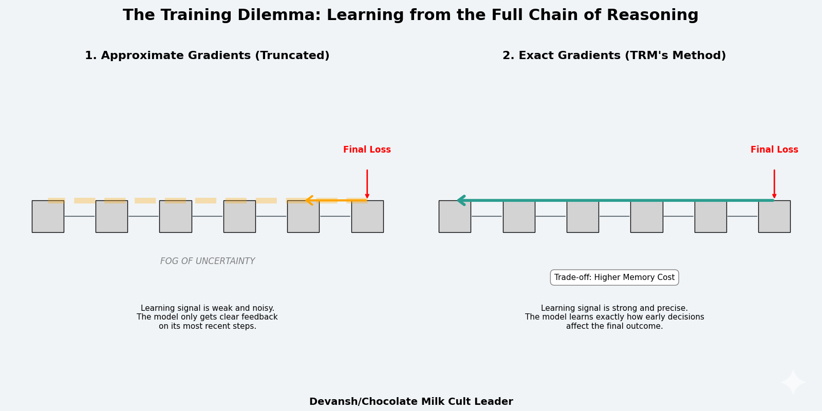 There’s a more principled alternative: just backpropagate through everything. Accept the memory cost. Store all intermediate states and compute exact gradients through the full recursion chain. This provides perfect learning signals — the model knows exactly how each refinement step contributes to the final answer.