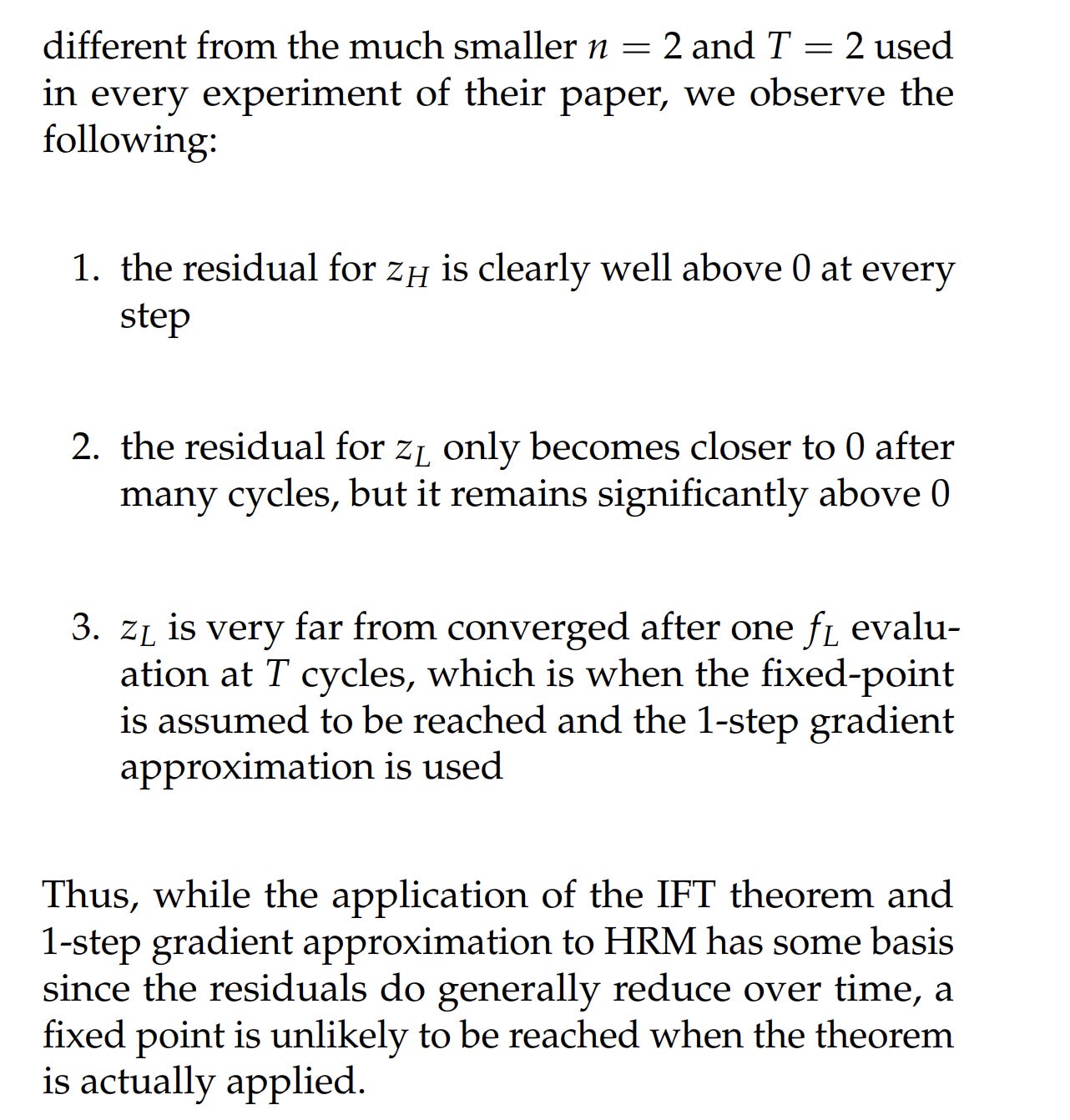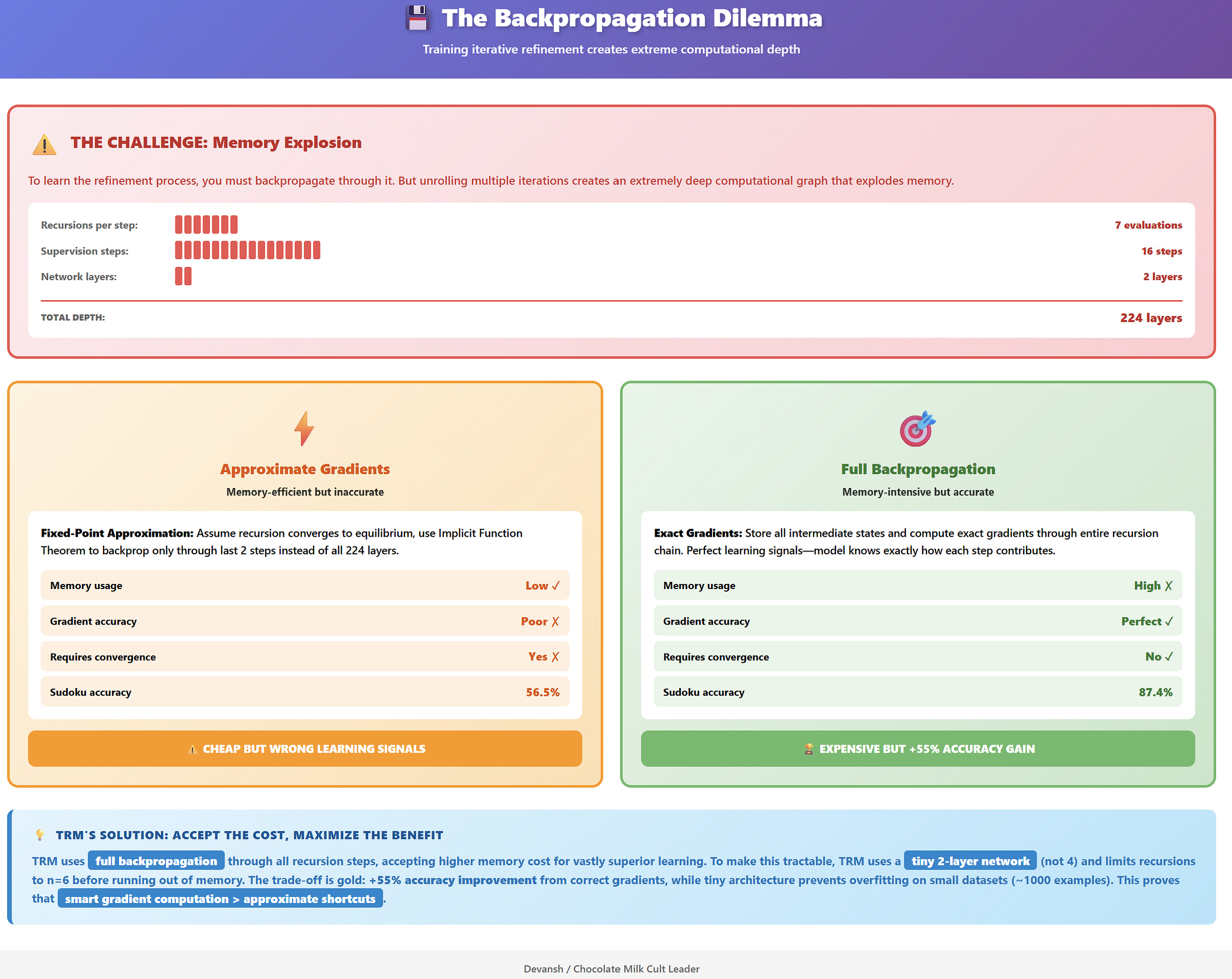 The problem: this assumes convergence actually happens. If your recursion doesn’t reach a fixed point, the theorem doesn’t apply, and your gradients are wrong. HRM (the predecessor to TRM) used this approach with a “1-step gradient approximation” — backpropagate through only the last two function calls, assuming earlier calls had reached equilibrium.
