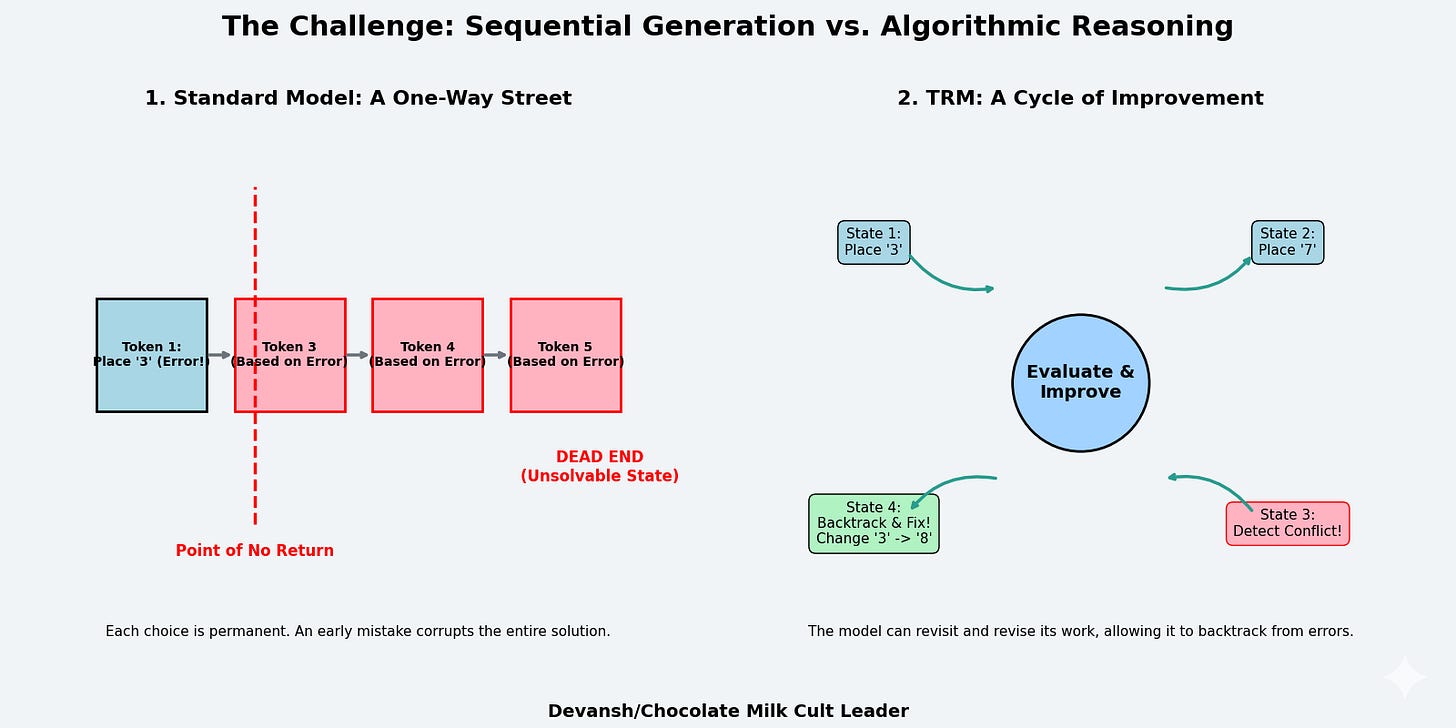 Where LLMs fail because they can’t revise, TRMs fail because they can’t generalize their revision strategy. Both are incomplete halves of cognition. The synthesis — recursive reasoning operating over general world models — remains the missing piece.