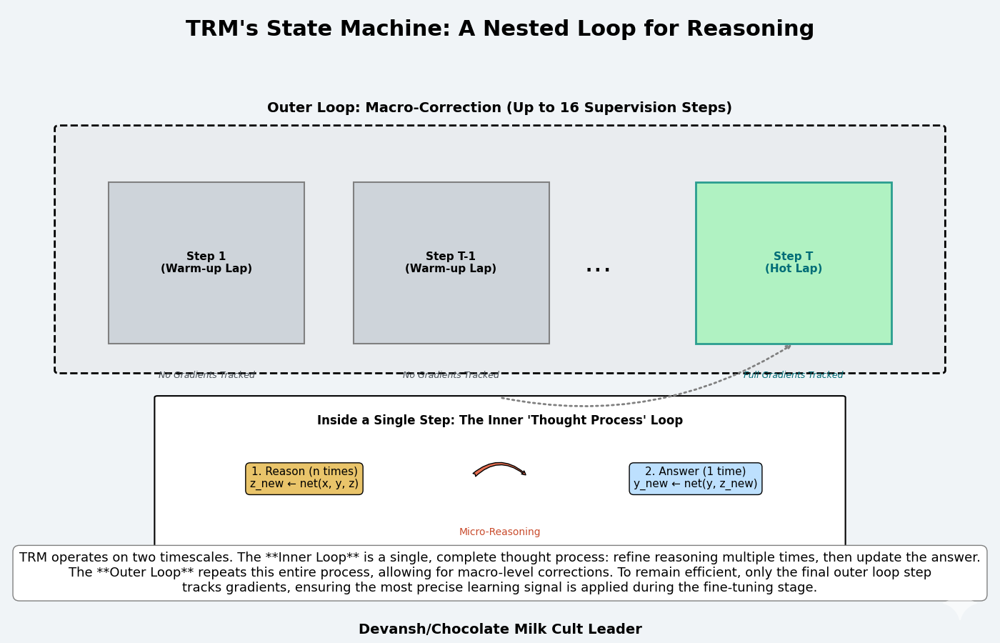 Starting ourselves in familiar territory, TRM solves the challenges of performing iterative refinement and stacking supervision steps with a nested loop structure built around a single, unified network.