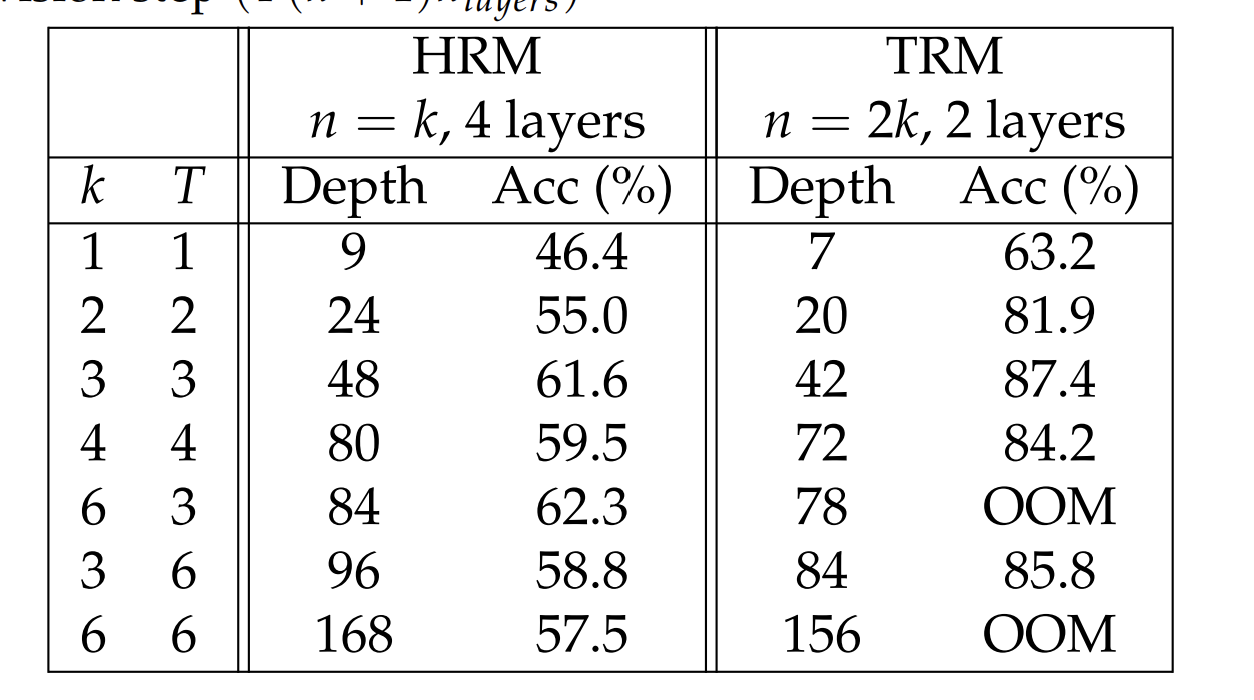 But this is expensive. Memory scales linearly with recursion depth. But within practical limits (6–7 recursions before running out of memory), the accuracy gain is massive. On Sudoku-Extreme, full backpropagation achieves 87.4% accuracy versus 56.5% with 1-step approximation. The improved gradient signal is worth the memory cost.