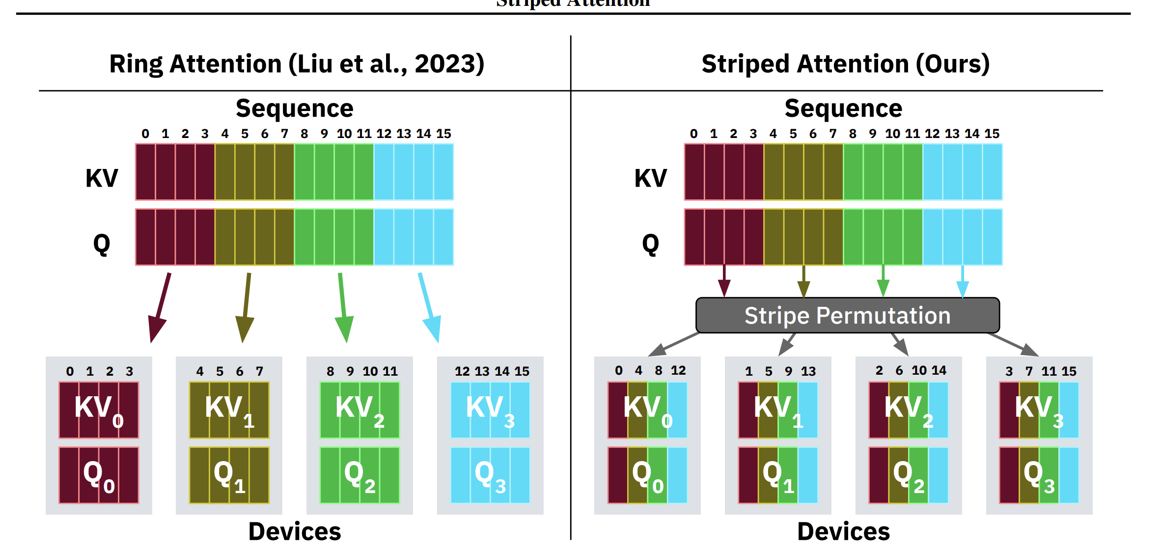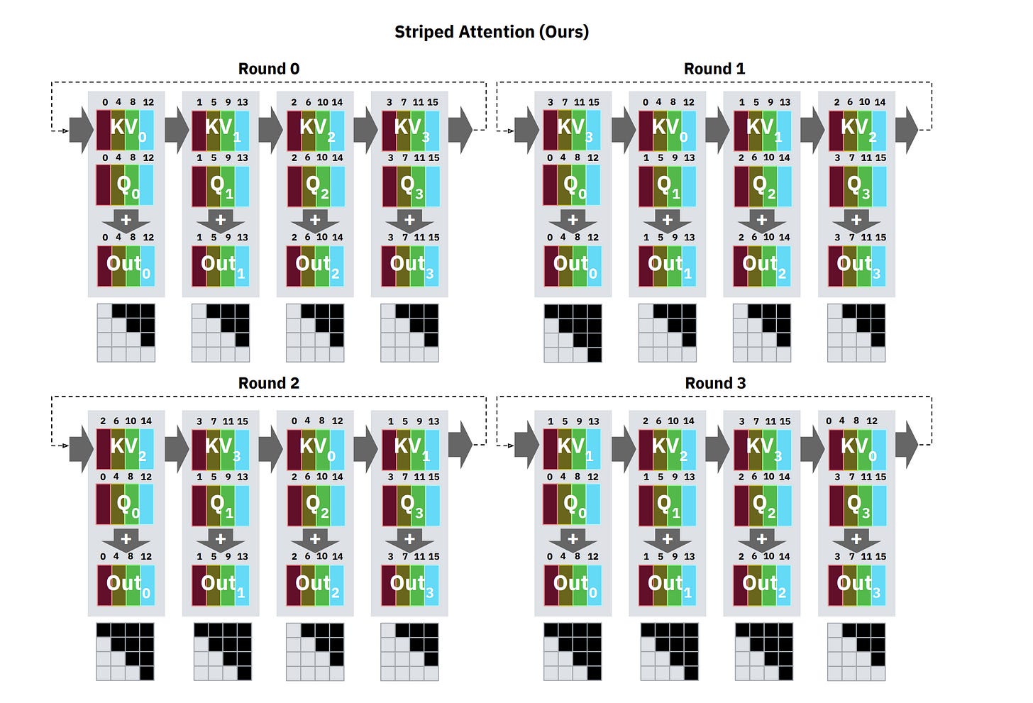 Spread the 21.47 GB KV cache across p = 4 GPUs (staying within a single node on NVLink). Each device holds ~5.4 GB of cache. With model weights distributed via TP4, each GPU holds ~8.75 GB of weights.