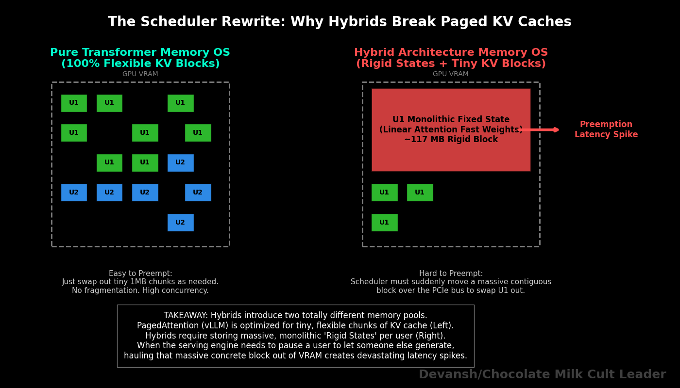 Hybrids move fewer KV bytes by deleting most attention layers and compressing the rest through SSM or Linear Attention blocks. You gain concurrency, lose some retrieval precision, and inherit a serving infrastructure headache.