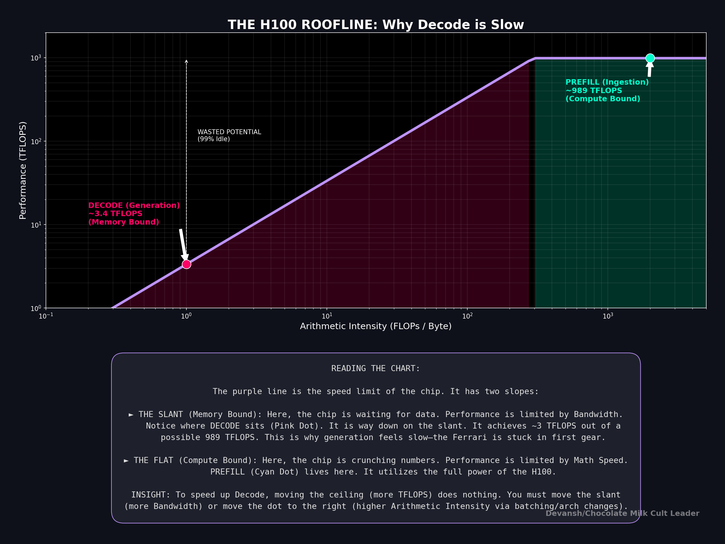To understand why decode is so painful, we have to look at the hardware’s “roofline” limit. A GPU’s performance is capped by either its peak compute (TFLOPS) or its memory bandwidth (TB/s).
