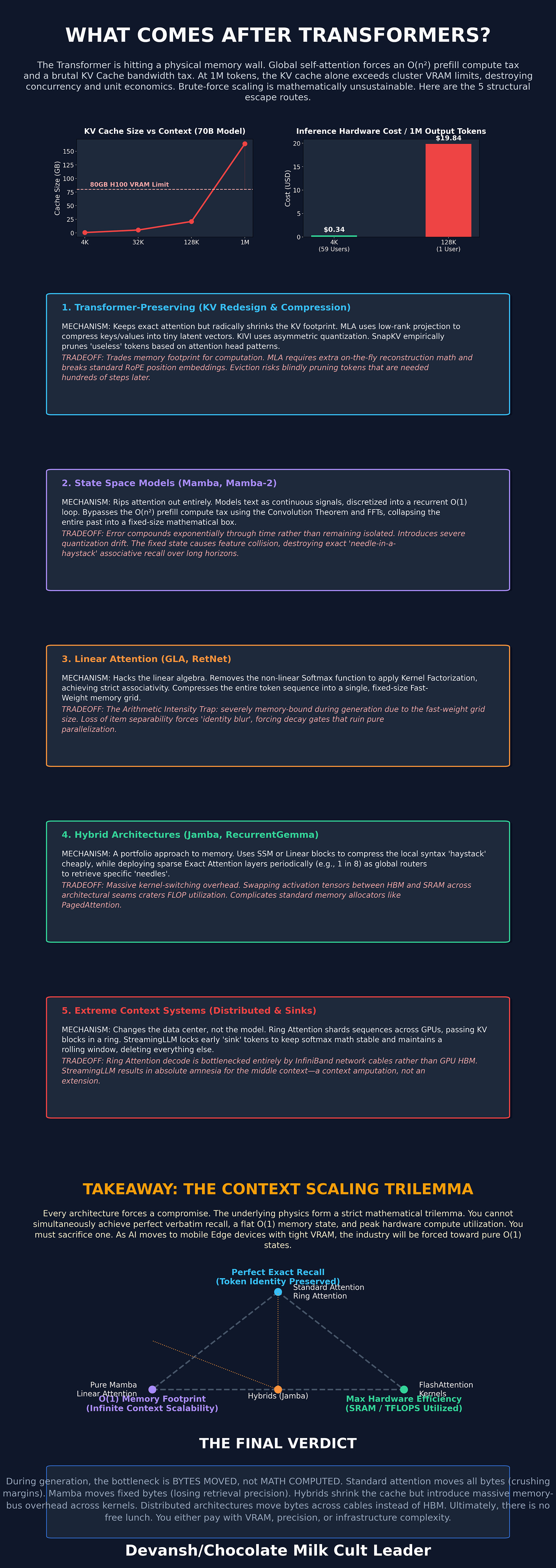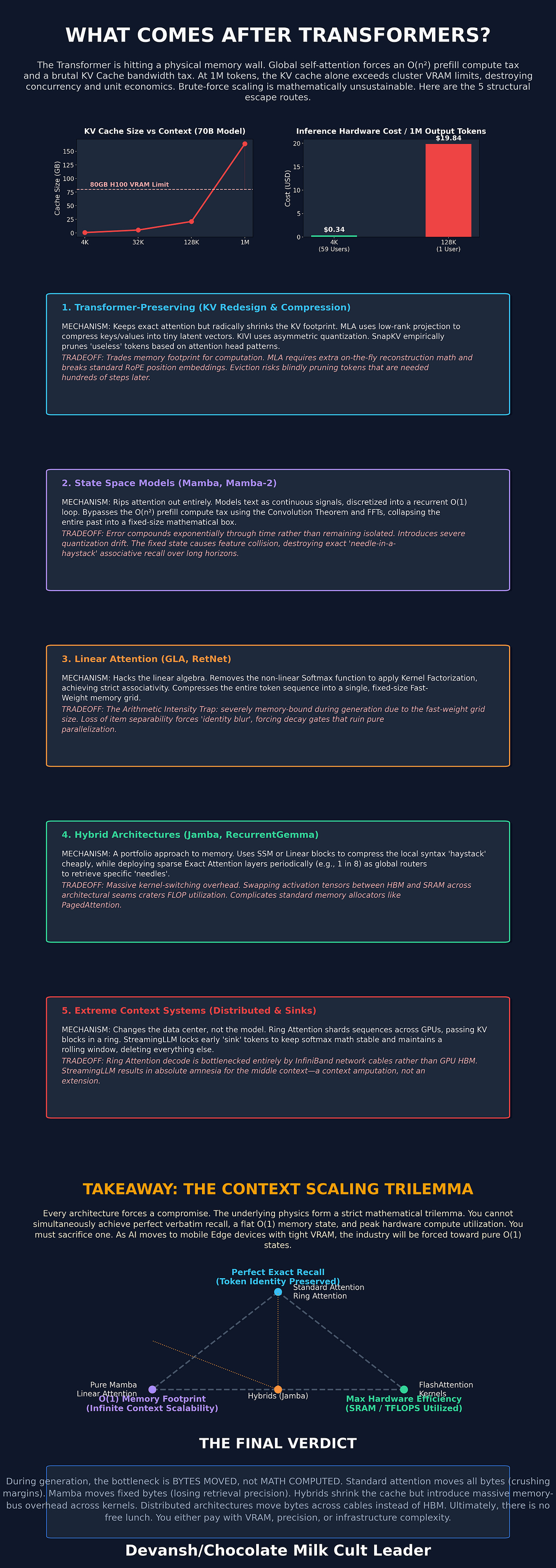 The article’s real point is that every post-Transformer design is making the same trade: what are you willing to sacrifice to stop moving so many bytes? Standard attention preserves perfect recall but destroys concurrency and margins at long context. Compression methods save memory but add complexity or quality risk. Recurrent and linear models fix memory growth but lose exact retrieval. Hybrids are the best compromise today. Distributed attention keeps quality, but the bill follows you into the network rack.