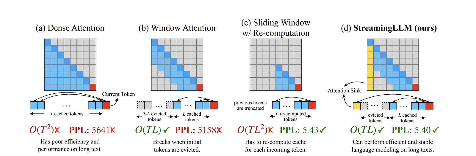 StreamingLLM moves almost nothing. Flat O(1) memory. Infinite input length. Everything outside the rolling window is amputated forever.