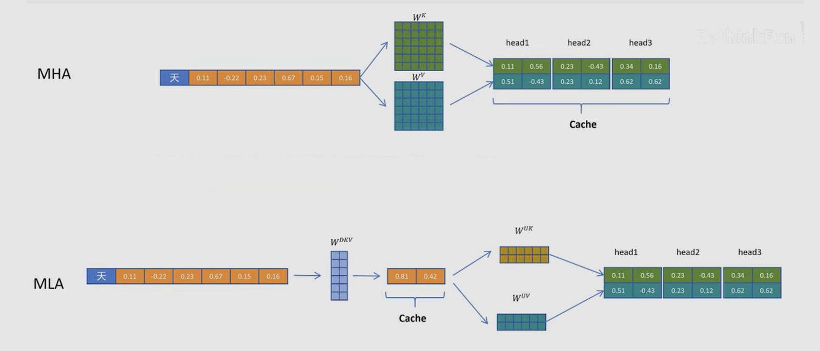 This is the exact mechanism behind DeepSeek-V2’s Multi-head Latent Attention (MLA). In standard attention, you cache the Keys and Values. In MLA, you project the token’s information down into a much smaller latent vector. During the decode phase, the GPU only appends this tiny vector to the cache. When it needs to calculate attention, it rapidly “up-projects” or reconstructs the Keys and Values on the fly.