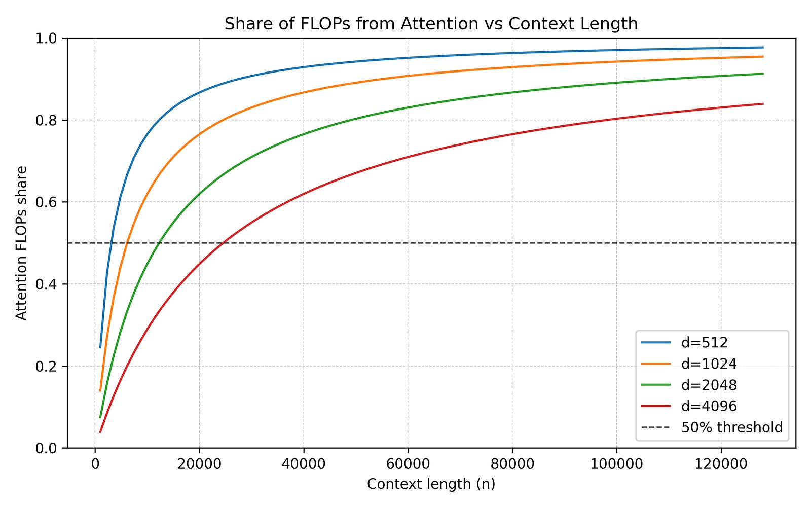 The compute required for a standard Transformer layer (dense attention plus dense MLP) roughly scales as: 24nd² + 4n²d.