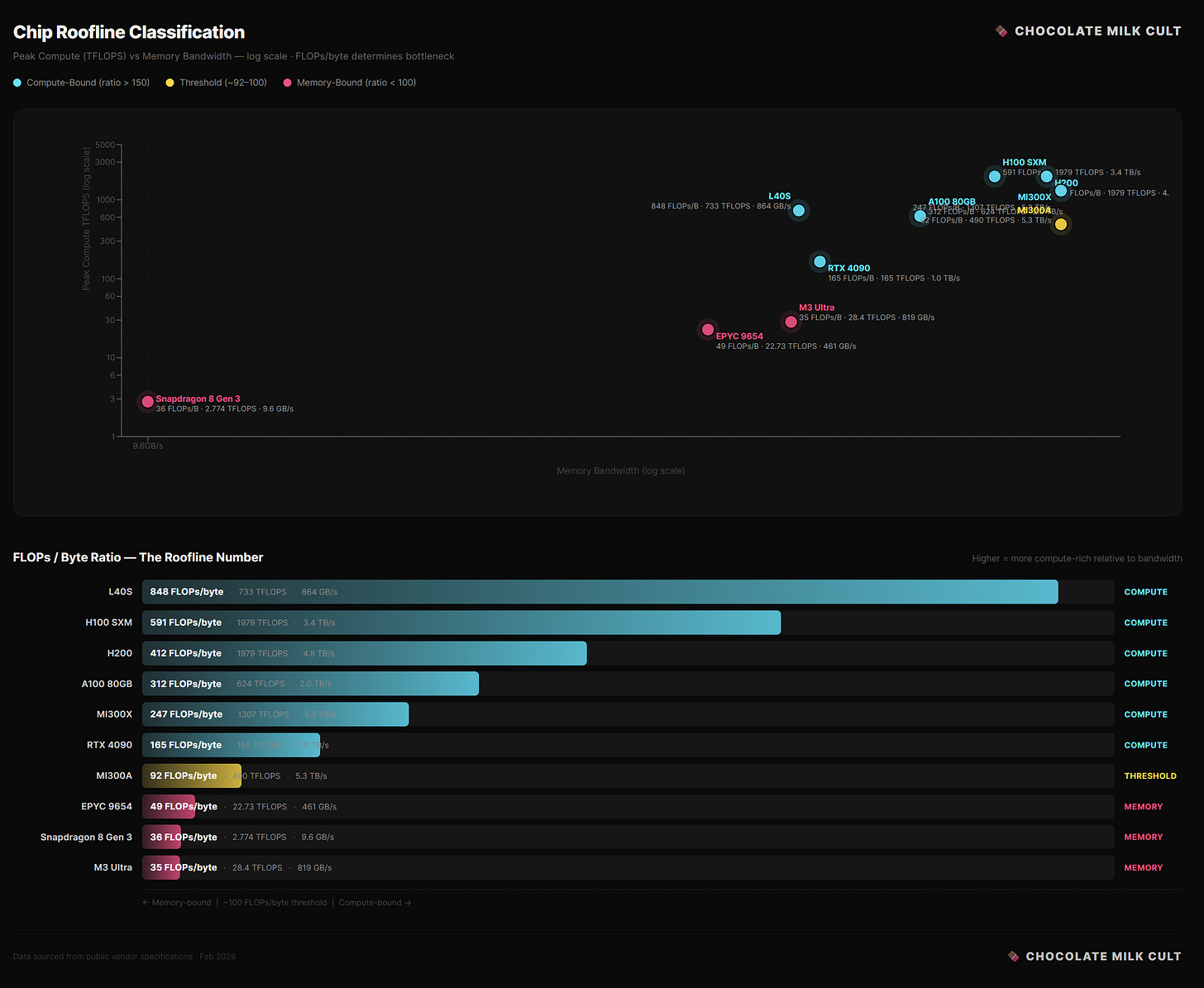 The deciding metric is Arithmetic Intensity: the ratio of math operations performed to bytes loaded from memory (FLOPs divided by Bytes).