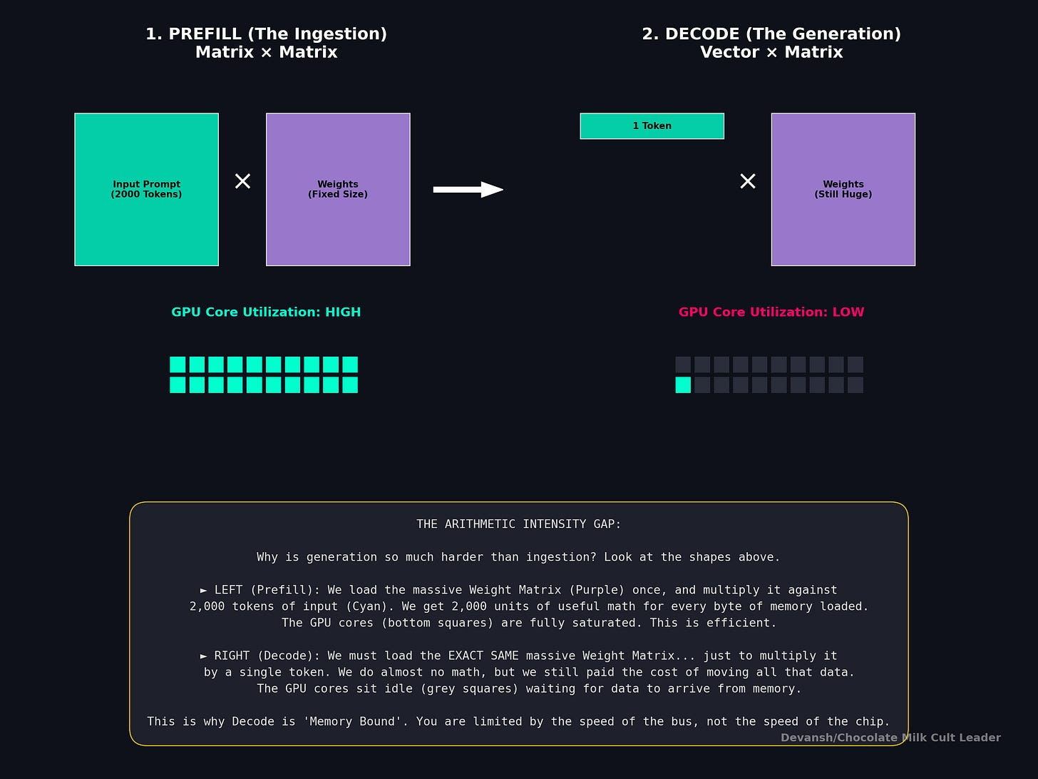 In the decode phase, the model loads the entire massive KV cache just to perform a tiny matrix-vector multiplication for a single token. The Arithmetic Intensity is practically zero.