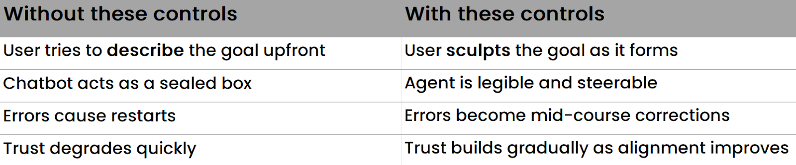 Better interfaces don’t mean ornamental UI. They mean interfaces that expose the structure the agent is already using internally: plans, steps, dependencies, intermediate drafts, tool calls. When users can see and shape those structures directly, alignment becomes something you do together rather than something you hope happened.