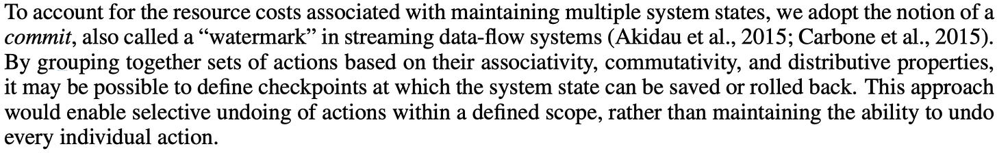 Similarly, they end up with some interesting design tradeoffs around damage control/reversibility. The easy case is if you can lean on a database to just handle undo operations for you. The harder case is if the actions are too complex to cleanly undo, and you have to snapshot different versions of your system state and restore them.