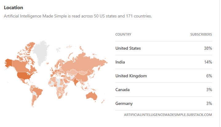We had a great 2023. Tech Made Simple more than doubled in readers from 2022. AI Made Simple (which started in mid-January 2023), is now at 130K readers (this was after moving 40K readers out of Substack to experiment with other platforms). Medium also made a comeback towards the later part of the year for me (we hit 11K followers there). Craziest of all, the cult has members in 171 countries.