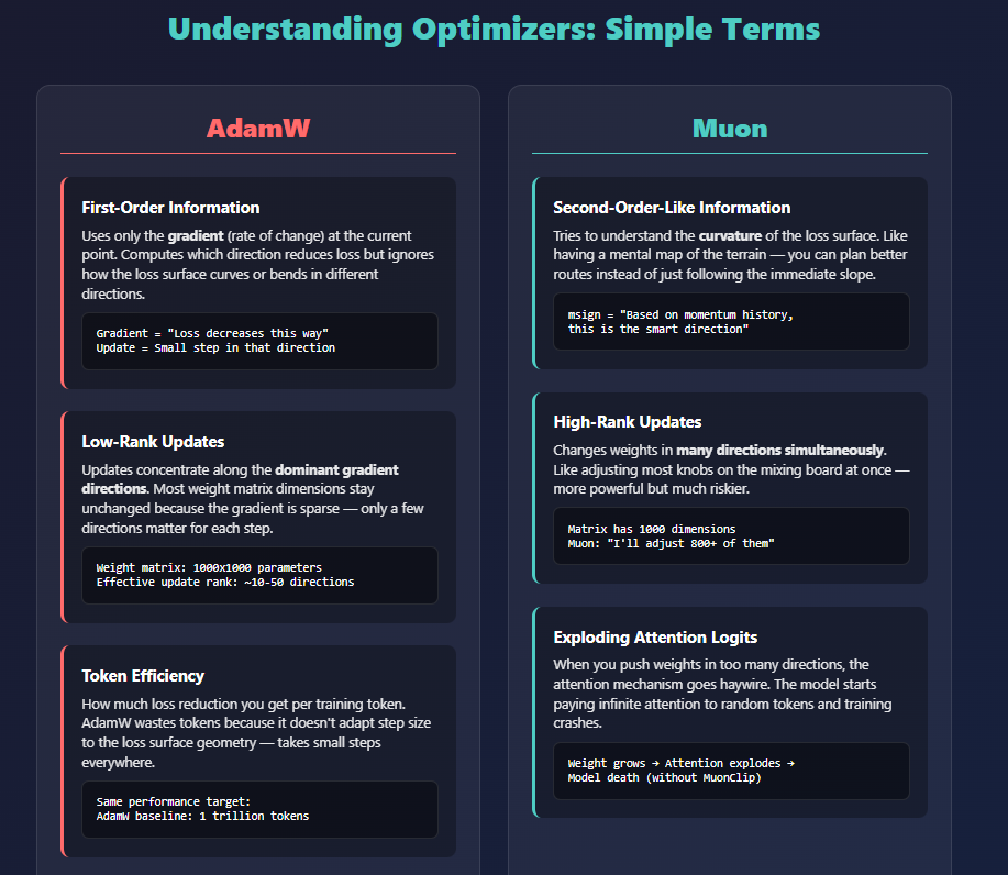 Kimi used Muon, a second-order–inspired optimizer with high-rank updates that adapt to the geometry of the loss surface. But Muon is unstable — it causes weight matrices to grow in ways that break attention. Kimi solved this with MuonClip, a per-head negative feedback mechanism that tracks logit growth and scales down projections before they explode. This allowed them to train on 15.5T tokens with zero loss spikes — unlocking convergence rates far beyond what AdamW can achieve.