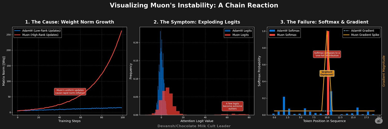 Thus, Muon’s superior geometric efficiency inherently risks catastrophic divergence due to how it propagates parameter growth through critical attention computations.
