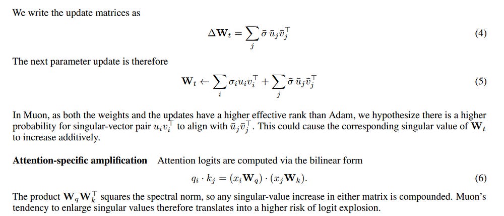 This creates a critical vulnerability within the Transformer’s attention mechanism. Attention logits are calculated from the product of weight matrices like Wq and Wk. The paper hypothesizes that Muon’s update style causes the singular values of these matrices to increase additively with each step.