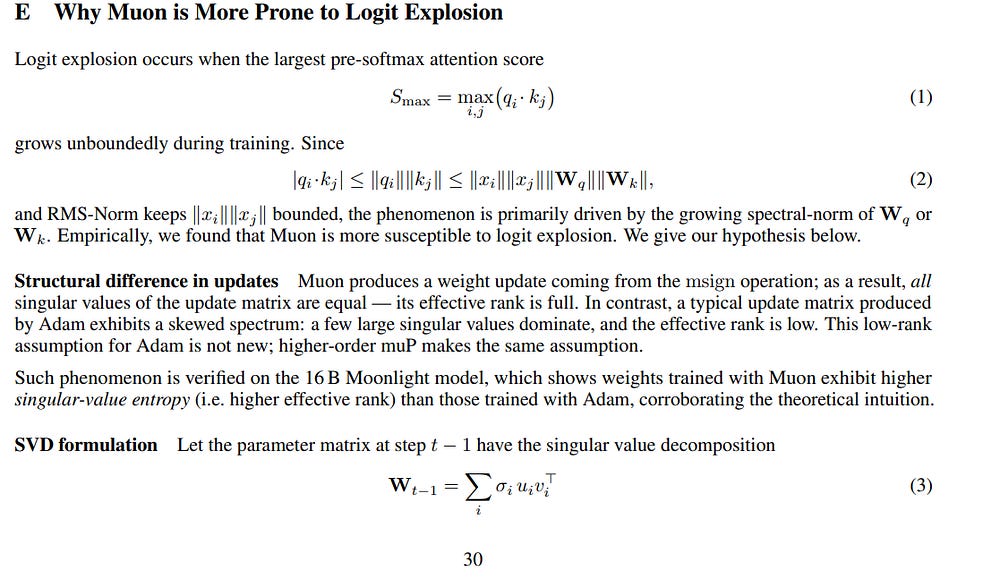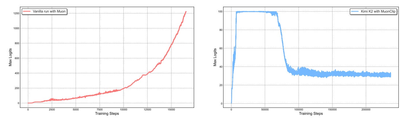 Kimi’s solution, MuonClip, is not a blunt instrument. It is an elegant, minimalist negative feedback controller designed to counteract the specific failure mode of Muon. It targets the cause (the weight matrix norms) while being triggered by an early symptom (the max attention logit). It is a higher-level process that runs alongside the optimizer.