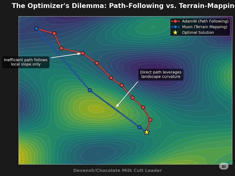 The choice of optimizer in deep learning is not trivial. The industry standard, AdamW, has been adopted widely because it provides stable convergence across diverse architectures and minimal risk of catastrophic divergence. Yet stability comes at the cost of efficiency — AdamW is token-hungry, slowly adapting to the geometry of the loss surface due to its reliance on first-order gradient information.