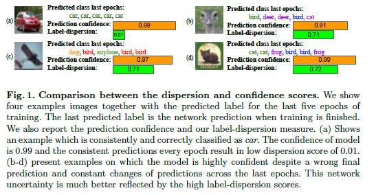 Above is the math they use to calculate label dispersion. The notation might seem intimidating but the idea is deceptively simple. We have our model predict the label of an image a bunch of times. If we have the same prediction, we will have a low label dispersion. Look at the image below. Since the model always predicts a car, it has low dispersion. If we have different labels being predicted, then our model is “confused” about them. This means a higher value. While the other images (b,c,d) have similar prediction confidence, they have significantly higher label dispersion values.