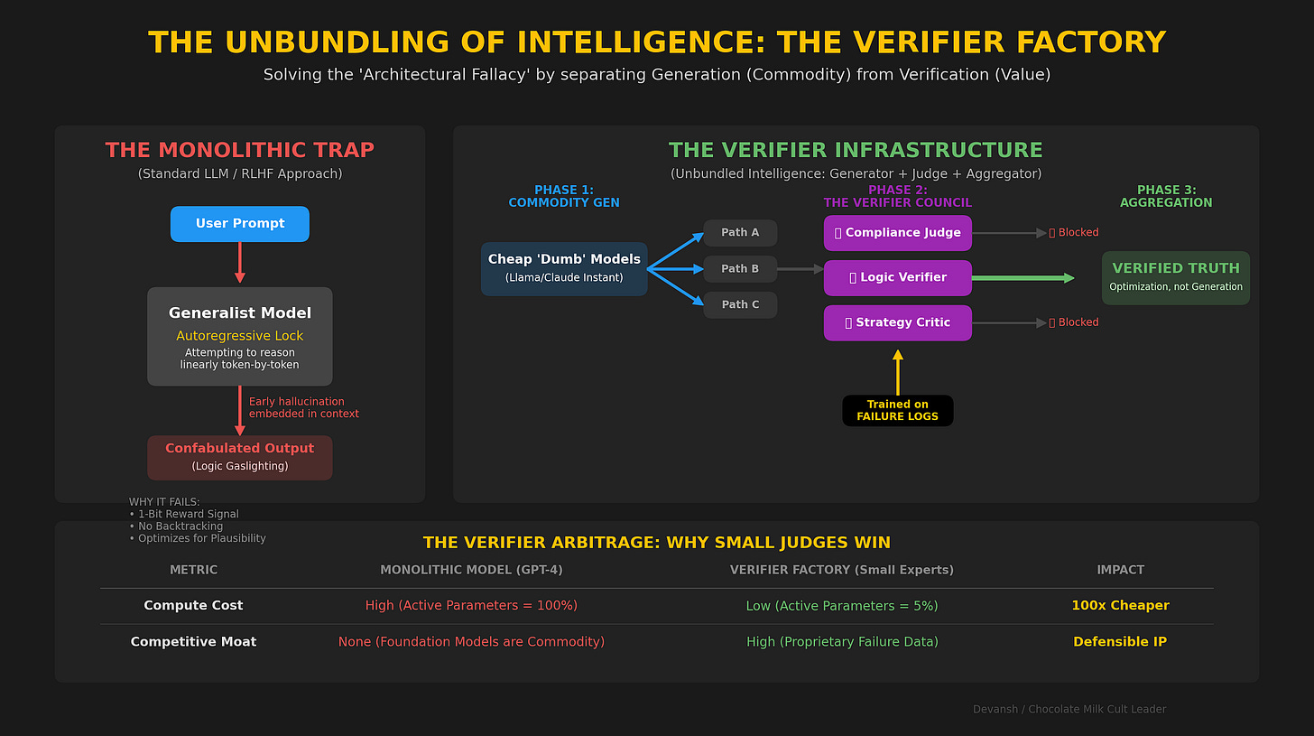 When a better open-source model drops, you don’t retrain your reasoning system. Swap the generator. The reasoning capability persists and gets amplified. If the unbundling follows it’s natural progression, you might even get granularly composed LLM workflows (we use the superior multimodal reasoning of Gemini and combine it with the superior stylistic drafting of GPT 4o). All this will allow the LLM ecosystem to compound and specialize (unlocking the next stage of Jevons Paradox for intelligence); something that’s non-negotiable for large scale AI diffusion into the biggest challenges of our times.