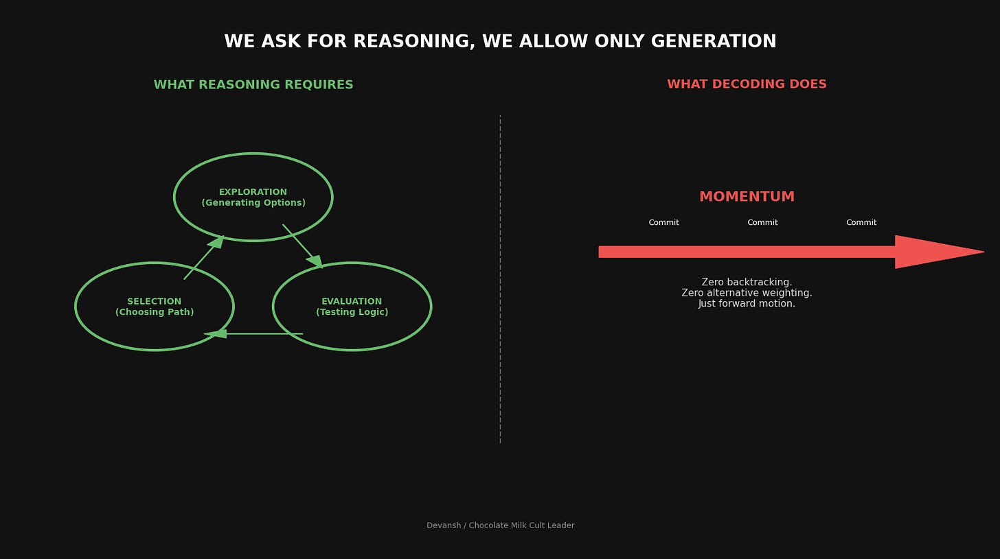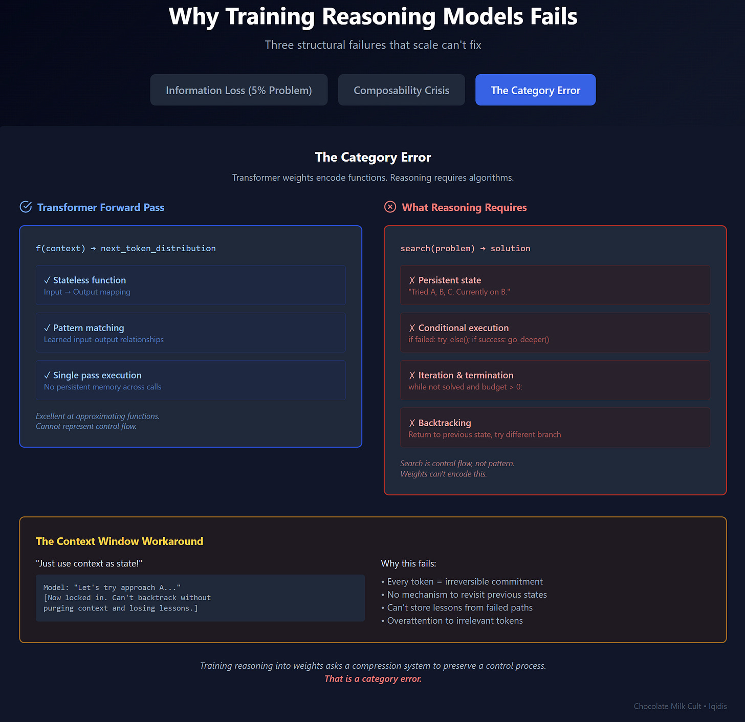Weights cannot encode search. Neural networks approximate functions; reasoning requires persistent state, conditional execution, iteration, and first-class backtracking. Transformers collapse decisions token by token, forcing premature commitment and making genuine backtracking impossible. This creates high variance, brittle behavior, and uncontrollable regressions, because “reasoning” is entangled with everything else in the parameter space.