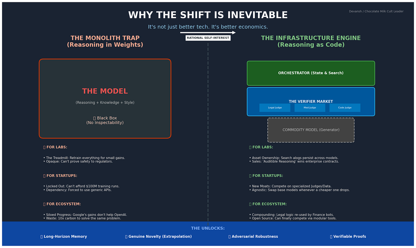 Labs can build models that excel at specific subtasks rather than forcing every architecture to be a mediocre generalist. Reasoning infrastructure becomes the universal adapter that composes specialized components.