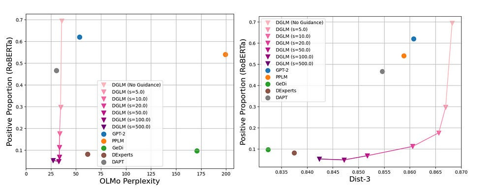 The results are honestly to die for — The framework maintains high fluency and diversity in generated text, indicating that the guidance mechanism does not come at the cost of language quality or creativity. The chart shows us that DGLM can nudge generations towards the desired goal (generate text with a negative sentiment), while keeping fluency (no major increase in perplexity) and minimal reduction in creativity (<4% drop in Dist-3)