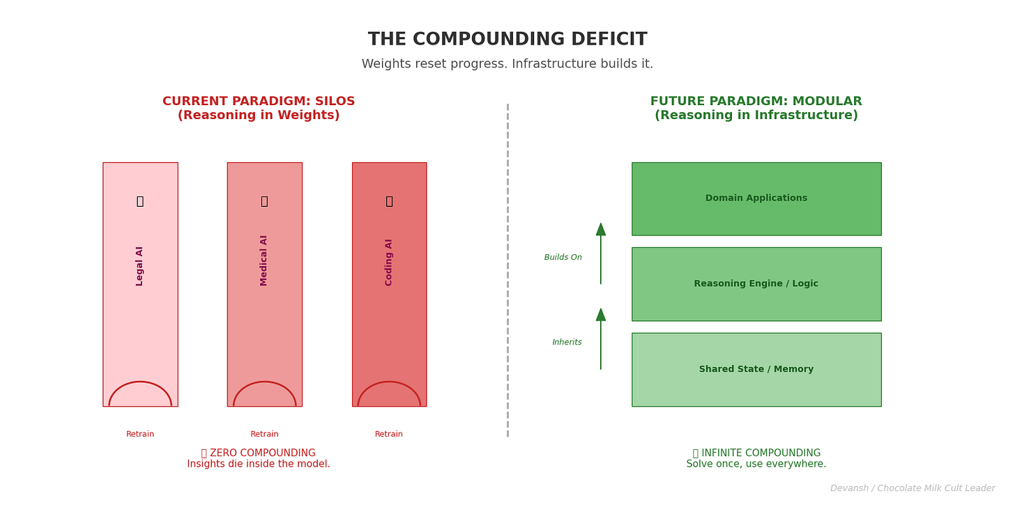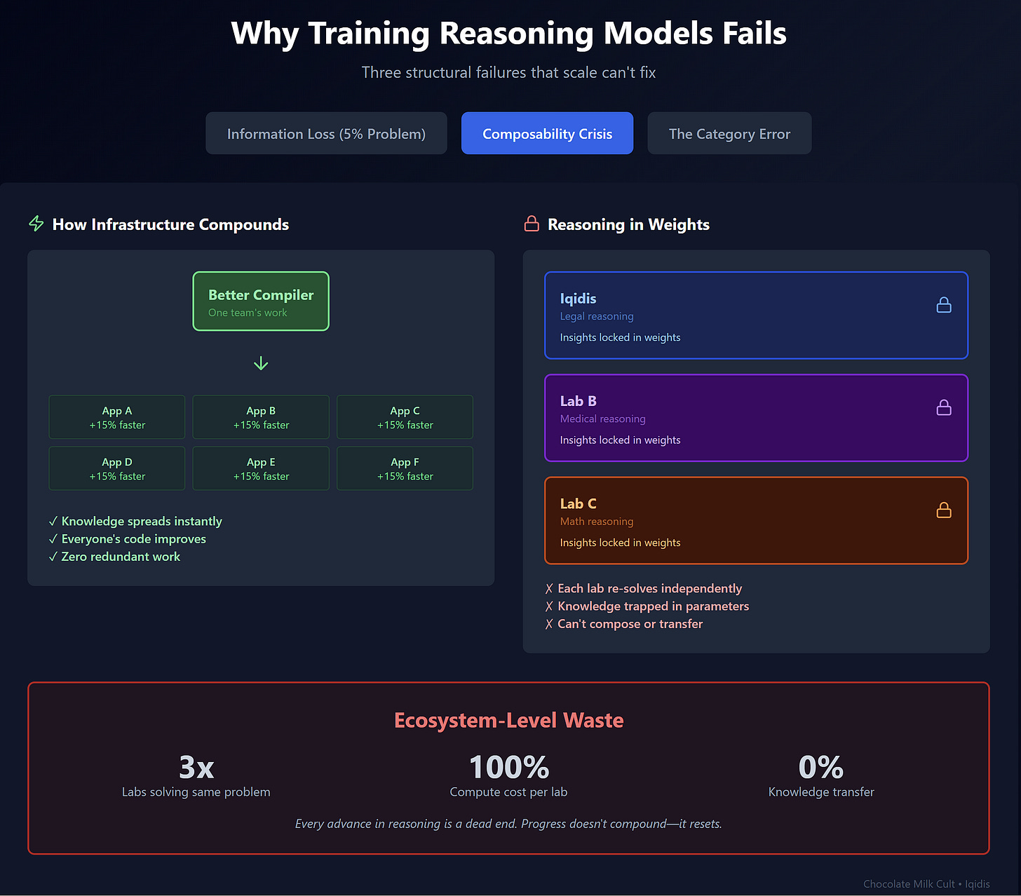 Training reasoning into model weights does not compound. It resets. The current approach ensures that every advance in reasoning is a dead end.
